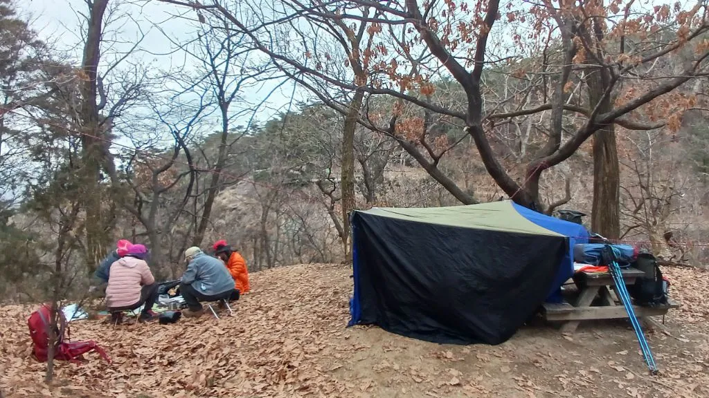 곧 점심을 먹는다. 연어회에 갈비도 나오고 대추와 삶은 계란도 푸짐하다. 텐드 안이 좀 좁아서 나는 네 분과 밖에서 앉아 먹는데 춥지 않고 따뜻하다.