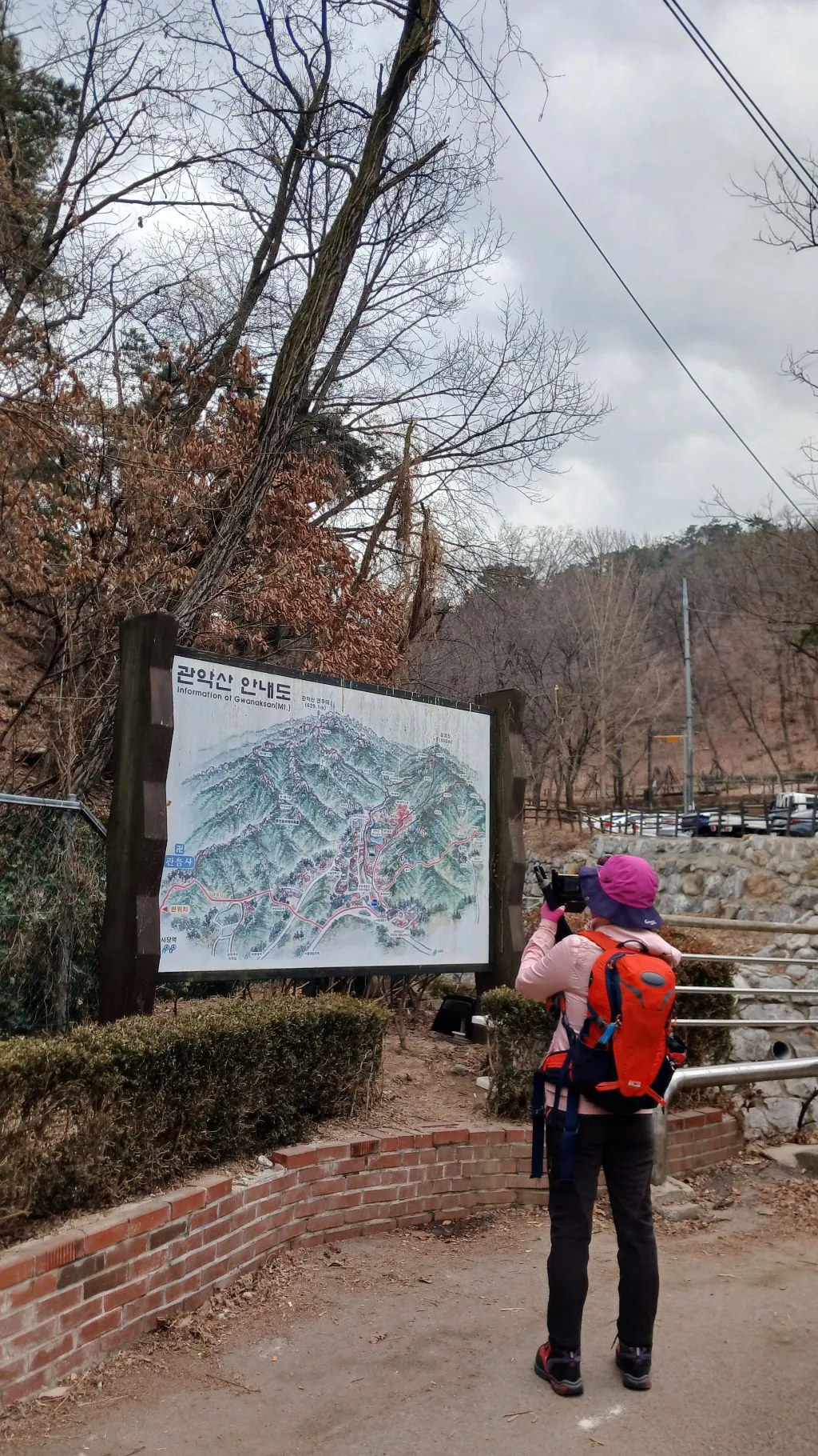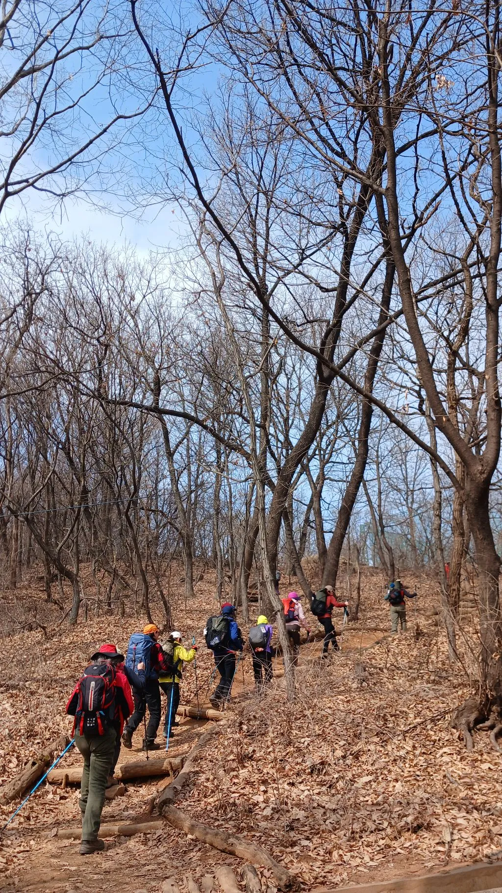 출발부티 겉옷 패딩은 벗어서 배낭에 넣는다. 조금 오르다가 서로 인사를 하고 본격적인 산행에 들어간다. 그래봤자 정상을 안 가는 둘레길 산행이라 여유가 있다. 콜럼보님, 다도예님이 내 그림 취미와 테니스엘보에 대해서 조언을 해주시기에 도란도란 잼나게 산길을 걷는다.