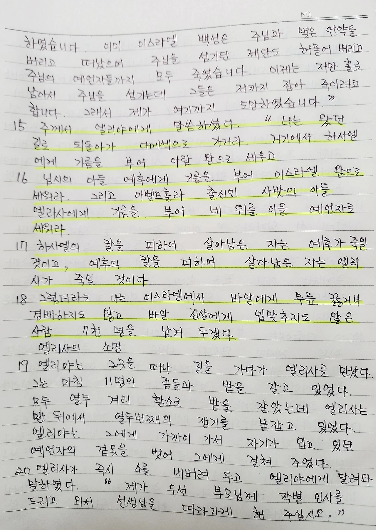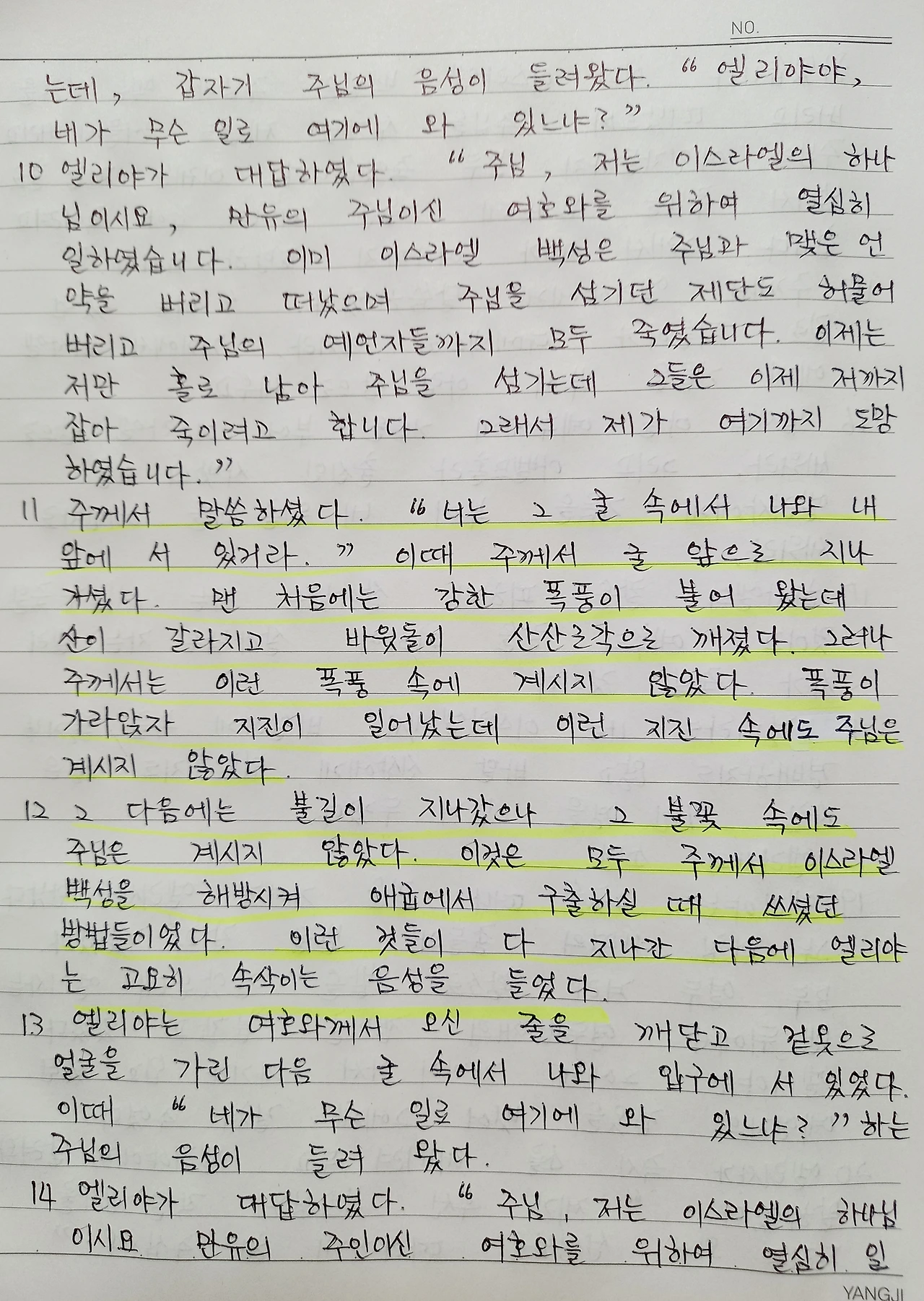 열왕기상 19장을 쓰고 묵상하며 바로 악의 대명사인 아합과 이세벨이 있음에도 자신의 사명을 끝까지 잘 감당하는 엘리야 선지자를 보며 힘을 얻는다. 우리 기독교에도 이런 참 지도자가 있으면 좋겠다. 많은 종교지도자들과 신자들이 악한 정권에 속수무책으로 휩쓸려 동색이 되어도 엘리야처럼 하나님의 음성을 바로 알아듣고 죽음을 불사하고 사명을 감당하는 그런 기독교 지도자 말이다.