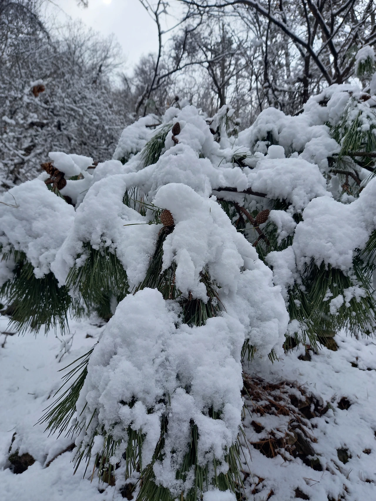 곧 점심을 먹는다. 눈보라가 친다. 나뭇가지에 쌓여있던 눈이 바람이 불자 떨어지면서 흩날린다. 우리들이 밥상을 차려놓고 앉아있는 밥터로도 날려서 무지 춥다. 바람을 등지고 앉은 나는 등 쪽이 선득거린다. 추우니까 밥을 빨리 먹는다. 점심식사 후에는 눈발 날리는 게 멋있어서 이모저모로 사진을 찍는다.
