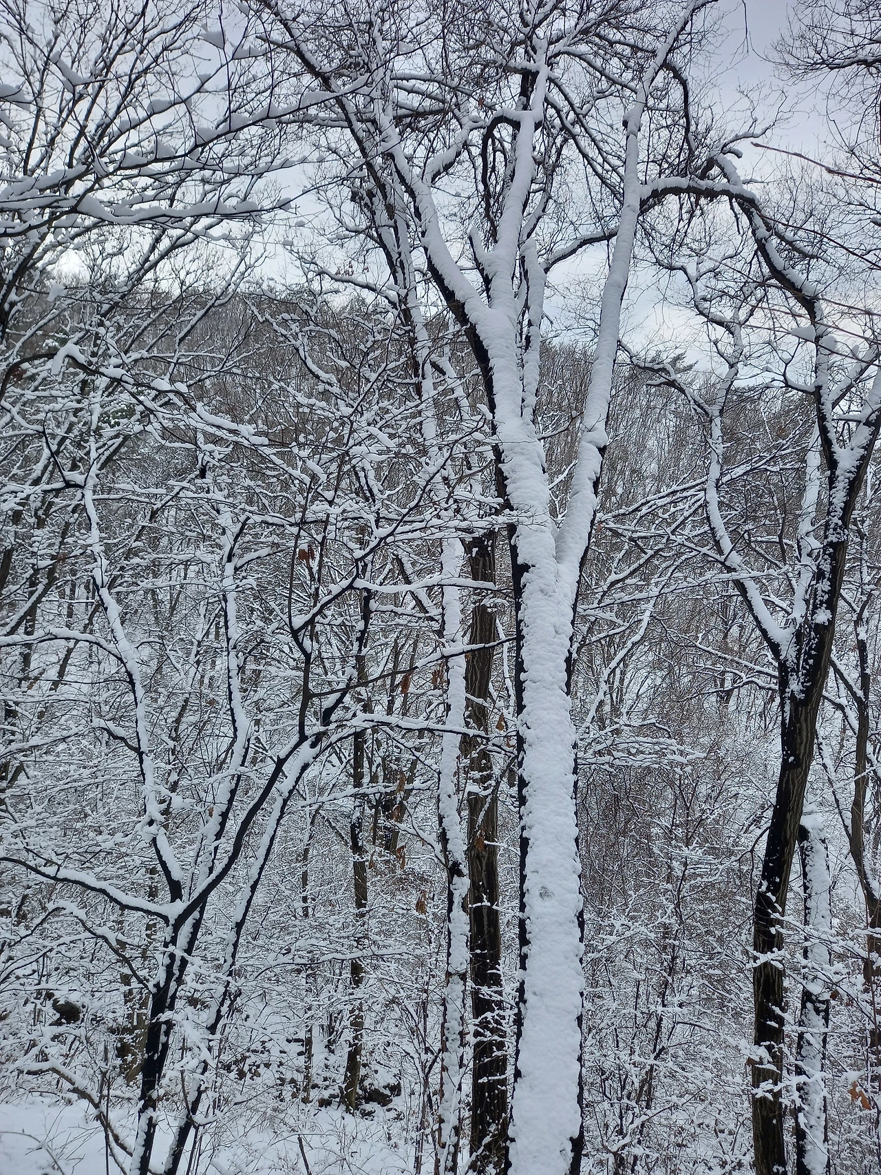 돌탑, 제1, 2, 3 전망대 지나 초막골생태공원 쪽으로 가는데 마지막 길은 정말 가파른 내리막길이다. 길다. 양지쪽이라 나무와 길에 쌓인 눈도 다 녹아서 길이 미끄럽기까지 하다. 나는 아이젠을 차서 내려가는 데 도움이 된다. 먼저 내려가는 여산우님들이 미끄러졌는지 여러 번 아우성 소리가 들린다.
