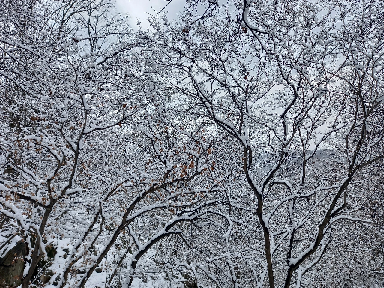 오늘은 정상을 가지 않는 둘레길 산행인데 응달쪽이 많아 눈이 제법 쌓여있다. 길에도 나뭇가지에도 둥치에도 덤불에도 새하얀 눈세상이다! 겨울이 아닌 봄에 만나는 눈꽃, 햐! 에너자이저! 그저 하이얀 눈꽃을 보며 눈길을 걷는 것만으로도 엔도르핀이 팡팡 솟는다!