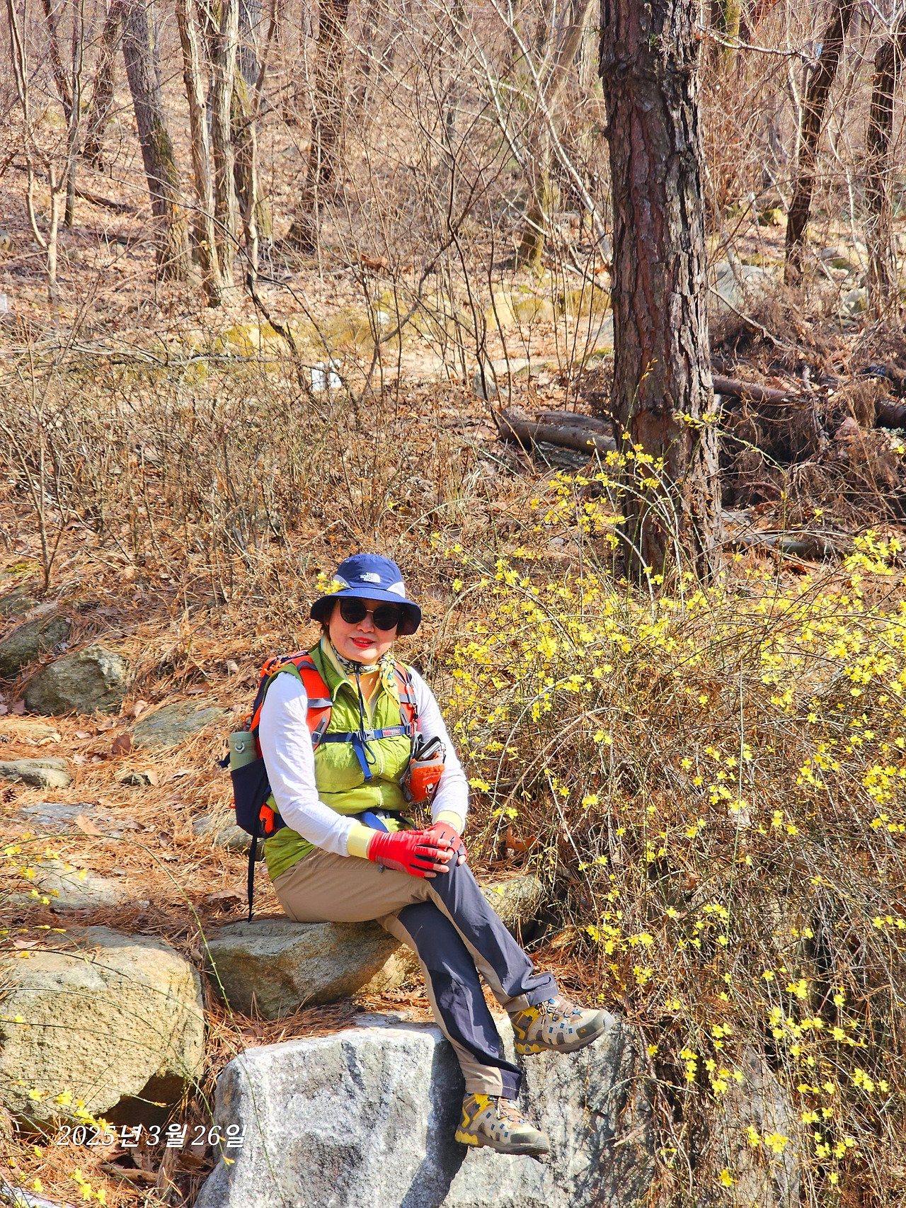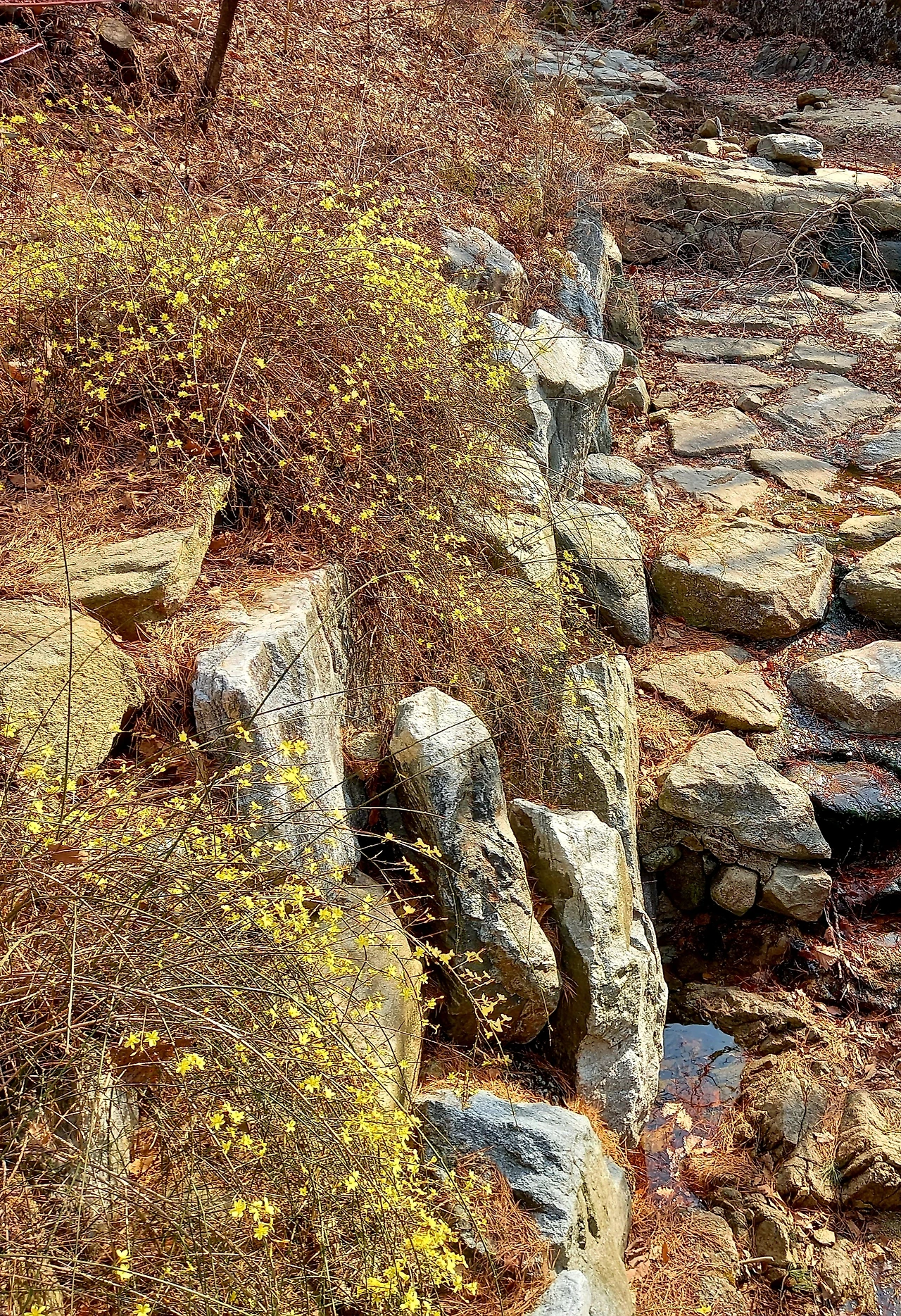 하산길에 노란 개나리를 닮은 영춘화가 개울가 돌담에 무리 지어 피어있다. 포토존이다. 예쁘게 멋지게 개인 사진들 찍어본다. 꽃을 꺾어서 손에 들어도 보고, 머리와 모자에 꽂아도 보고, 소년소녀 감성이다.