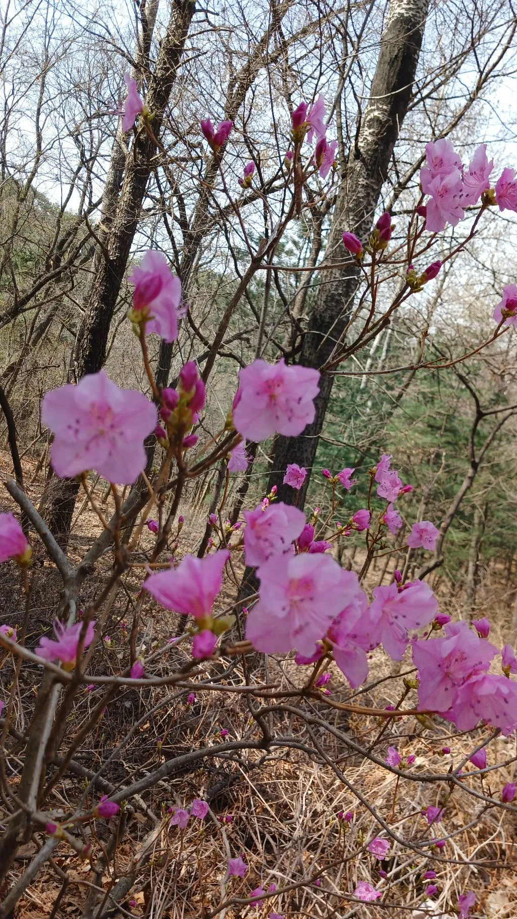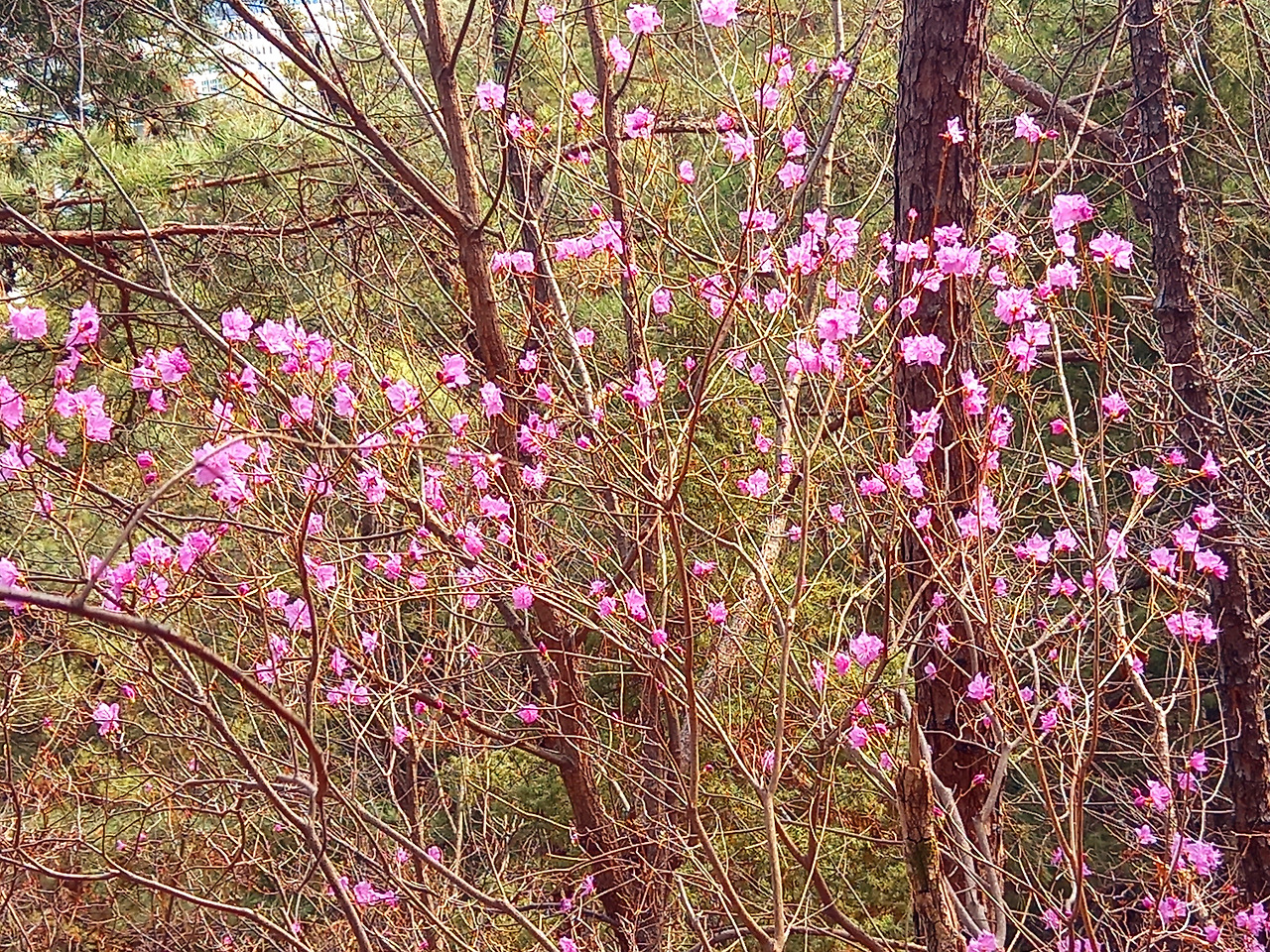군데군데 봄꽃이 반긴다. 진분홍 진달래가 활짝 피어서 아직 초록물이 올라오지 않은 나무들 사이에서 한껏 자태를 뽐내고 있다. 생강나무 노란 꽃도 제법 피었다. 무채색 속에서 분홍, 노랑꽃들이 눈에 확 띈다. 발걸음이 자꾸 멈춰진다. 핸드폰 카메라도 눌러본다.