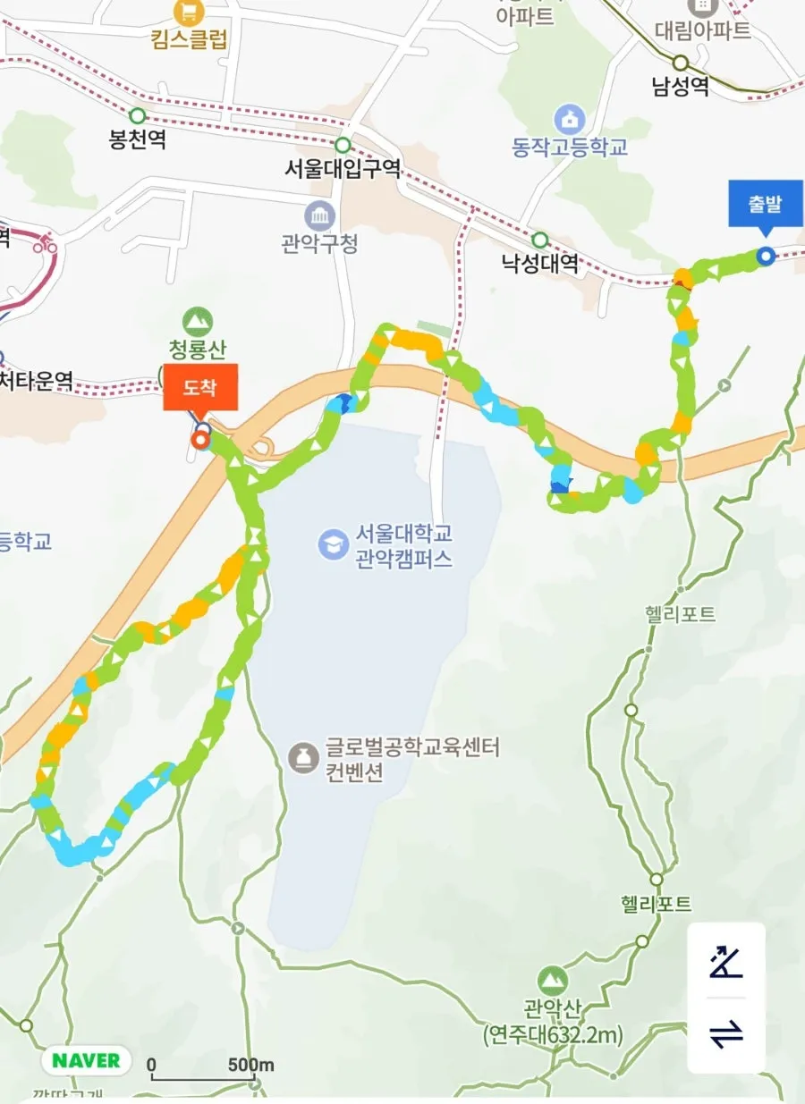 서울대 정문을 지나간다고 했는데, 우리는 별대장님의 선두를 놓치고, 오른쪽에 서울대가 보이는 산길로 계속 걷는다. 그래도 후미는 인대장님이 맡고 계셔서 안심이다. 두 대장님 간 통화 후 서울대로 내려와 교정을 지나서 정문을 바라보며 관악문으로 간다.