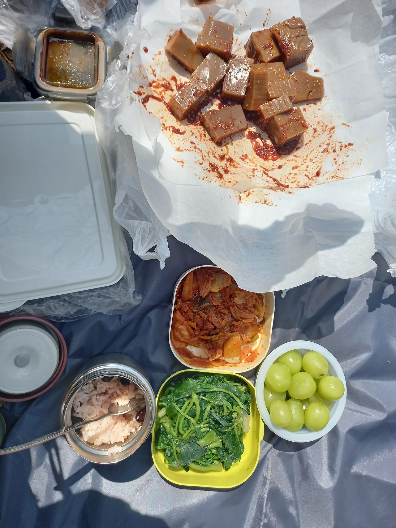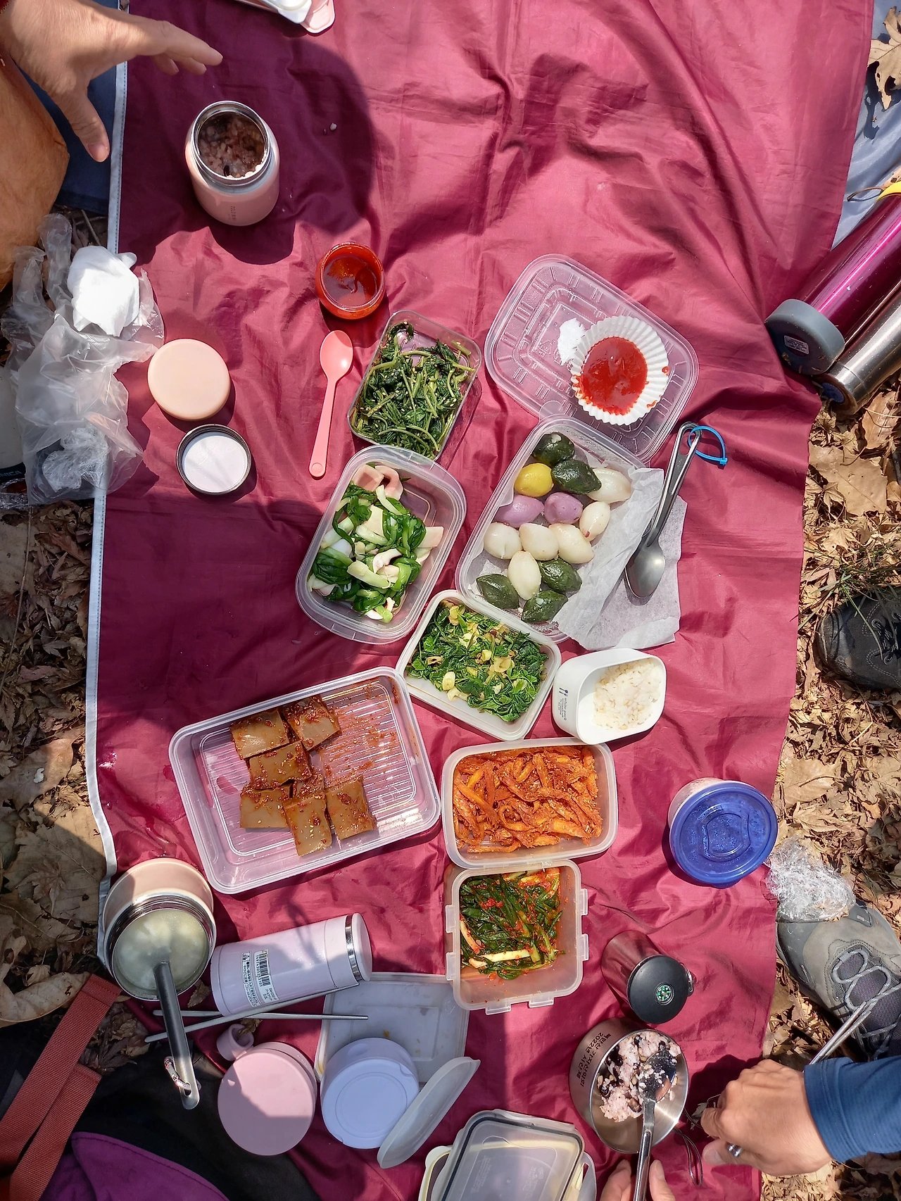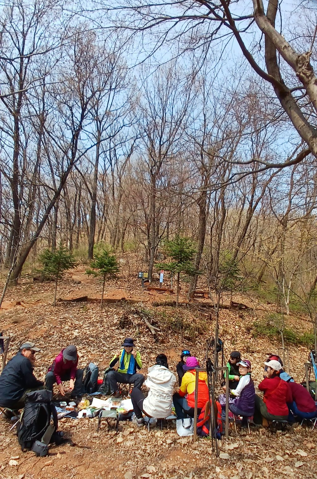 그렇지만 곧 넓은 밥터를 찾아 예쁜 산수유꽃, 산목련꽃이 바라다 보이는 곳에서 점심식사를 한다. 초롱이님은 도토리묵과 양념장을 가져와서 즉석 무침을 만들어낸다. 참깨도 솔솔 뿌려서 도토리묵무침이 고소하다. 산우님들이 가져오신 잡곡밥에 오색 송편, 팥부꾸미 같은 떡말이, 오징어무침, 황태채무침, 방풍나물, 김치볶음 등 맛깔스러운 반찬이 푸짐하다. 후식으로는 바나나에 청포도, 보랏빛포도 몇 알씩 먹는다. 담소하며 한껏 먹고 커피까지 마시고 나니 배는 부르고 배낭은 가볍다. 신기하게도 싸 온 밥만 꺼내서 먹고 나면 배낭의 무게감이 확 줄어든다.