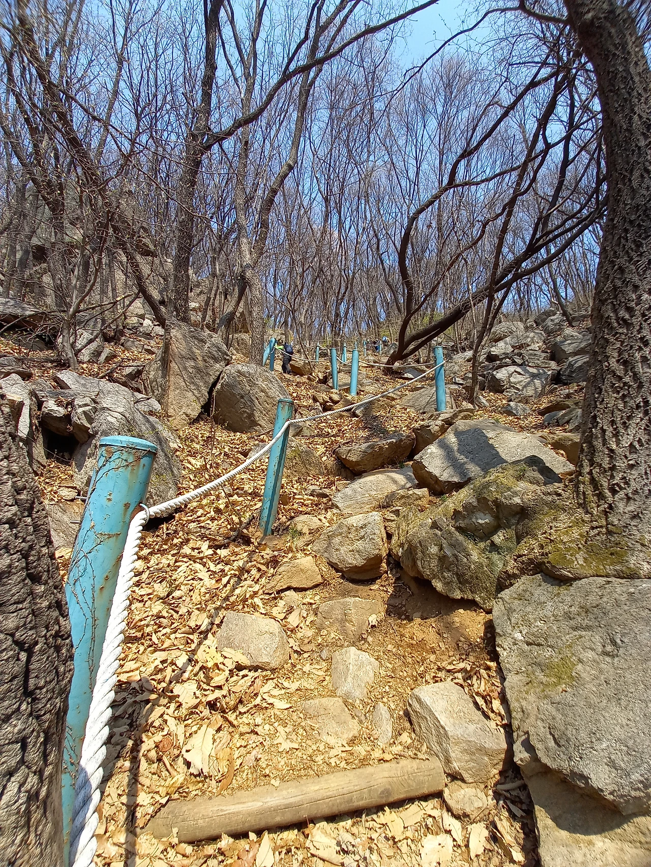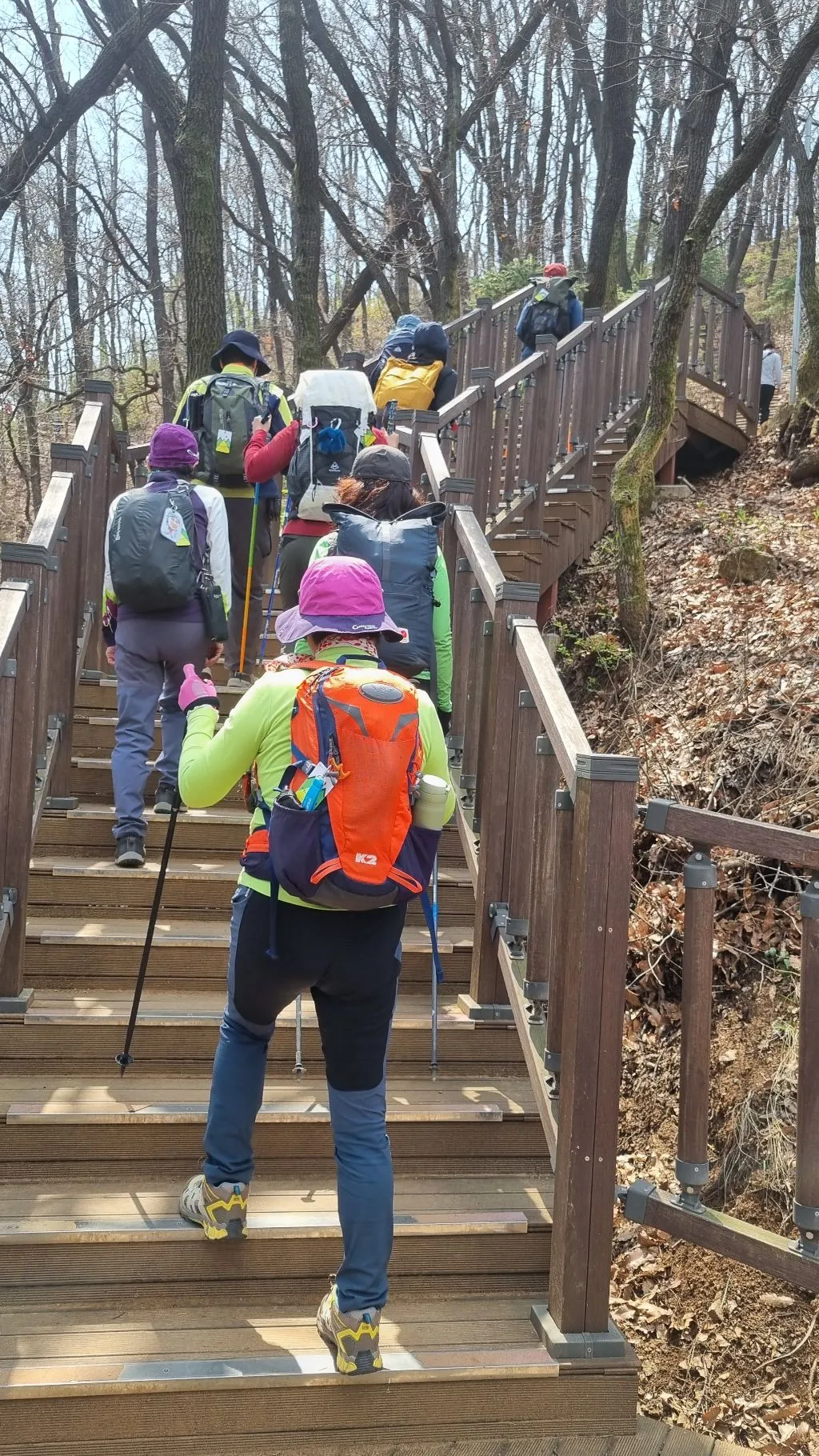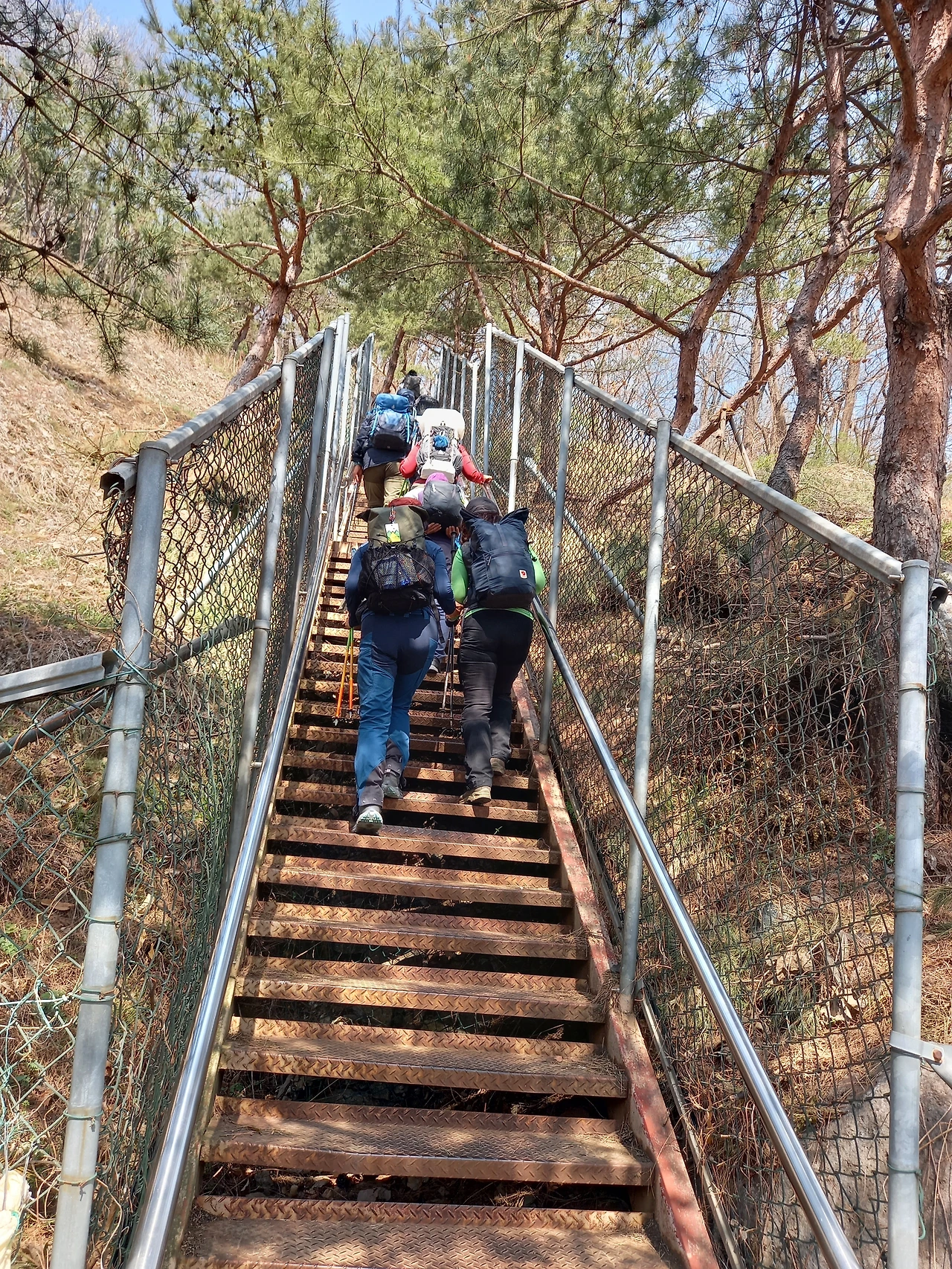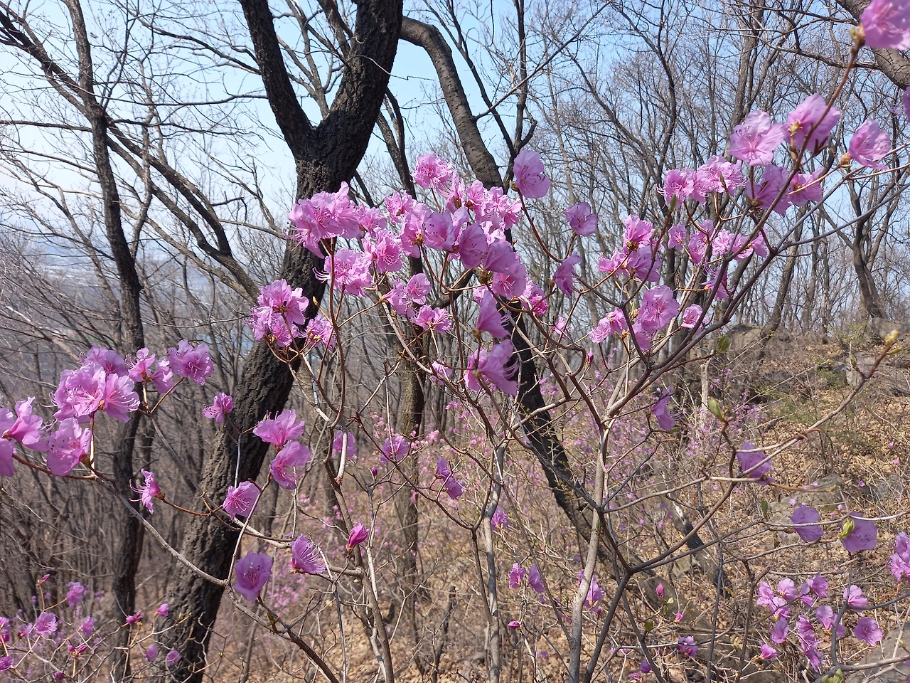 내려올 때는 데크길이 더 안전해 보여서 가파르지만 그 길로 내려온다. 양쪽에 진달래가 곱게 피었다. 다들 하도 빨리 내려가기에 사진에는 담지 못하고 서둘러 내려온다.