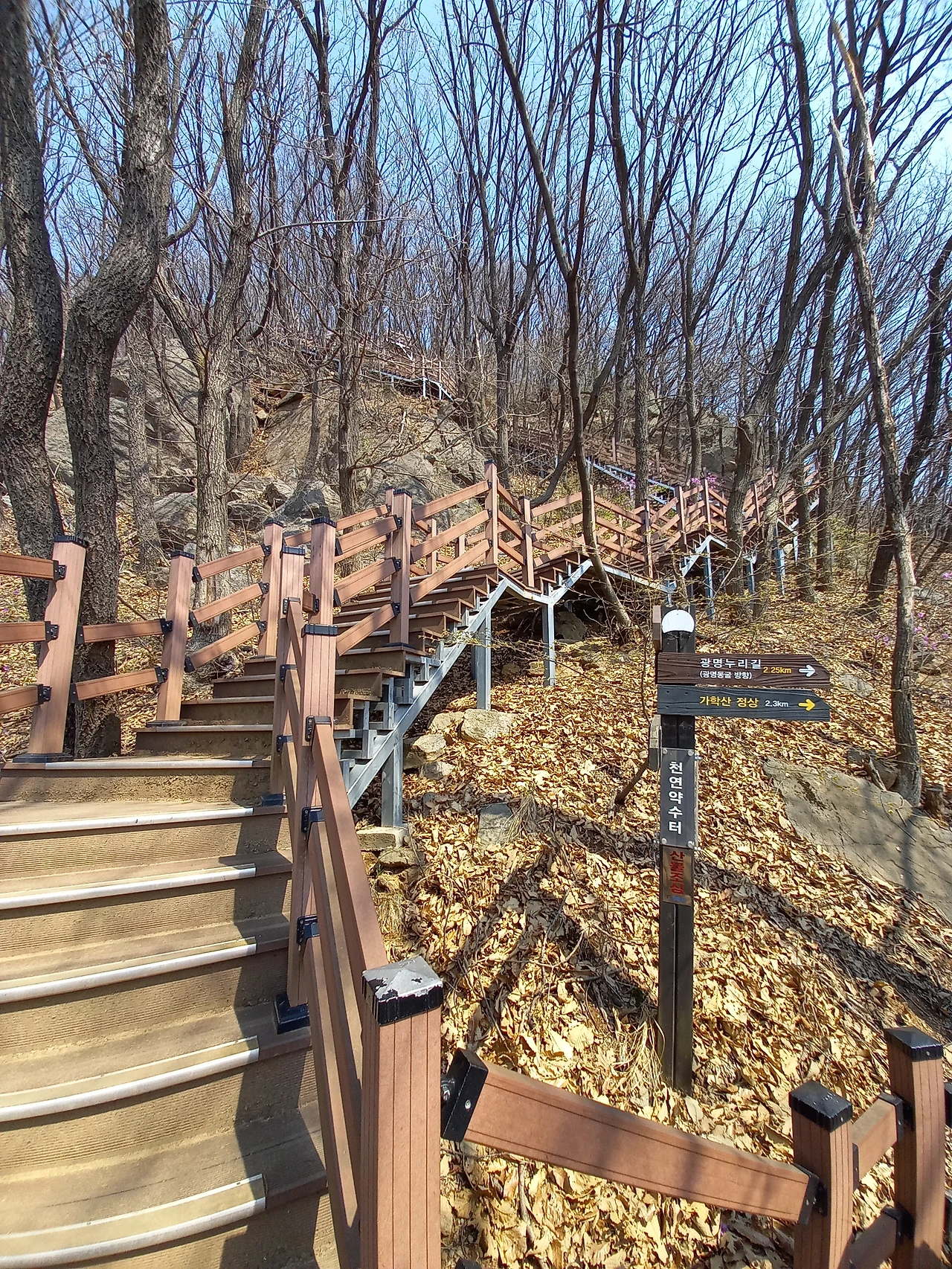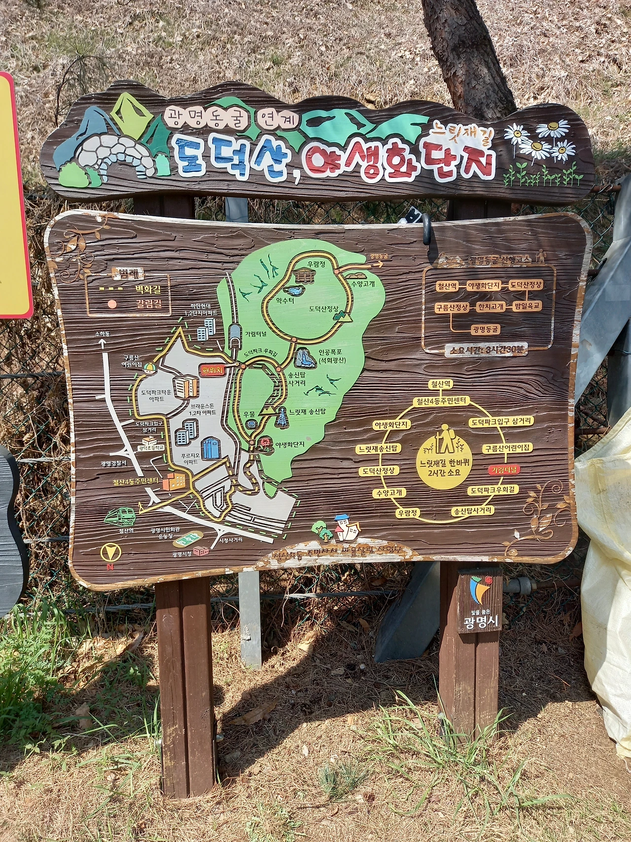 철산역에 내려 2,3번 출구로 나오는데 2번 출구는 막혀있고 도덕산 들머리도 막혀있는 곳이 많다. 산 밑에 아파트로 들어가서 높은 계단을 몇 개나 올라가니 도덕산 입구가 나온다. 초반부터 힘든 오름길이다. 힘이 쫙 빠진다.
