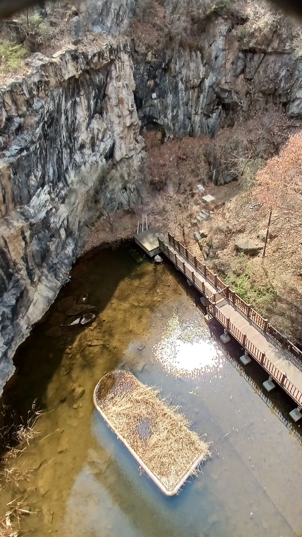 인공폭포는 미가동 중이고, 절벽 위에 진달래 한 그루가 유난히 탐스럽다.