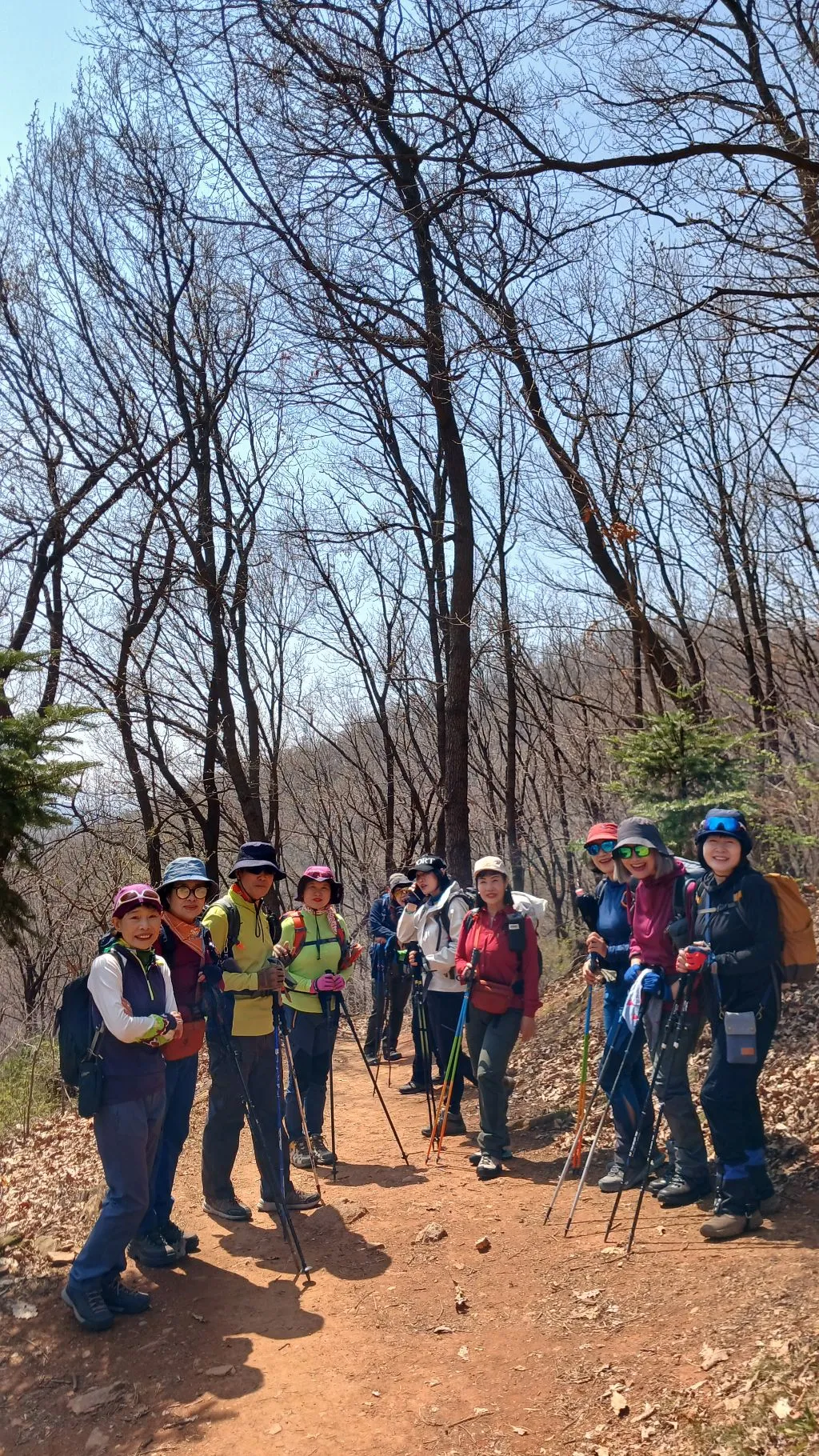나도 노래를 부른다. 뒤에서 따라오는 이가 장단을 맞추어준다. 발걸음이 흥겹다. 무리 지어 피어있는 개나리 꽃밭에서 여산우님들과 사진을 찍는다. 모두 앞서가고 사진 찍느라고 5명만 후미이다. 그래도 느림의 미학 힐링산행이니 여유가 있다. 앞서가는 이들이 어디에선가 기다려줄 것이다.