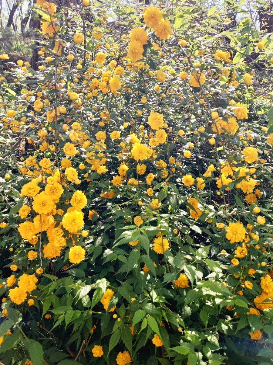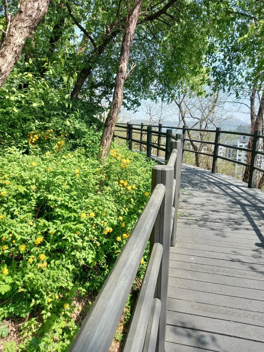 독립문역 5번 출구 밖에서 만나 출석체크하고 간식을 받고 우리 동기인 박성연 부총장님 기도한 후, 이경회 동창회장인 김지훈 회장님에게 산행 안내를 받고, 단체 기념사진을 찍고 출발한다. 한 10여 분 도로길을 걸어 한성과학고를 지나 안산자락길로 들어선다. 초반이 가파른 데크길인데 아주 짧다. 곧 데크로 잘 만들어놓은 평지길이 이어진다. 서대문 이음길이라는 안내도가 군데군데 세워져 있다. 주변 산과 서울시내를 보며 걸을 수가 있다. 데크길 양쪽으로는 진노랑 황매화가 지천이다. 오늘은 일명 '황매화 산행'이라 불러도 좋겠다.