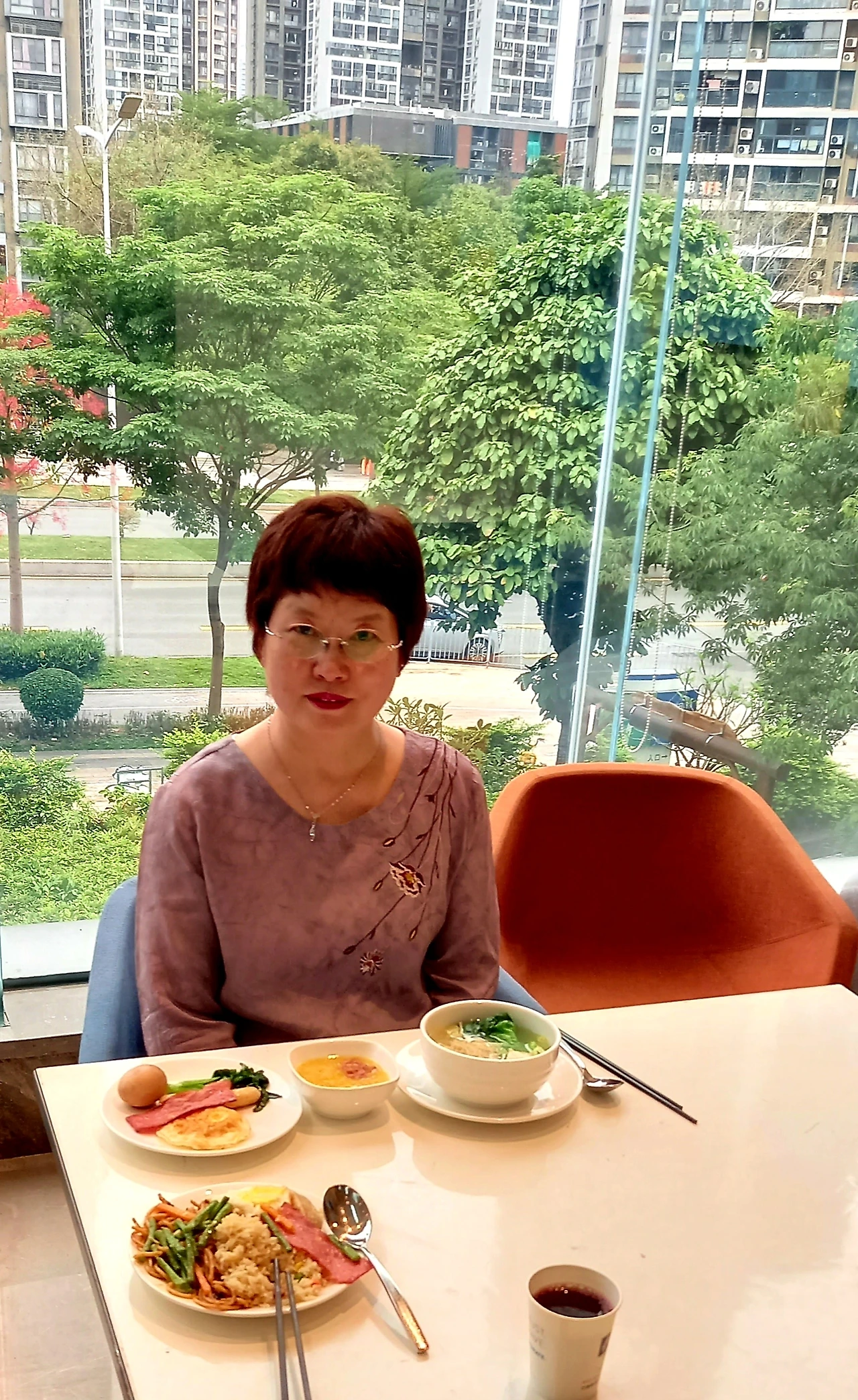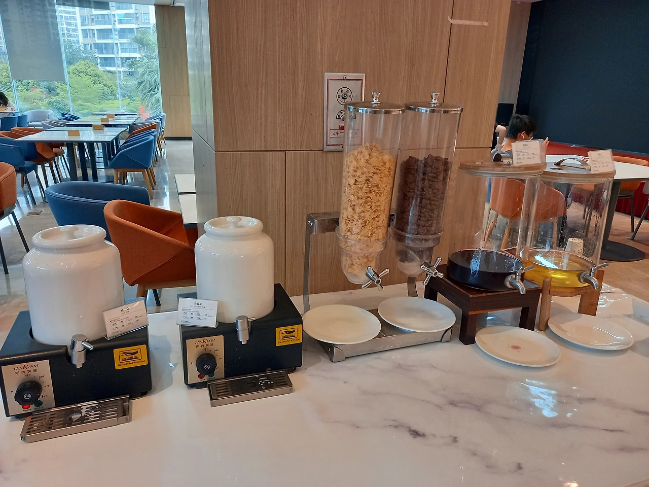 우리는 창가 쪽에 자리를 잡고 앉아서 바깥풍경을 보면서 먹기로 한다. 공원과 산이 바라다 보인다. 뷔페식인데 골고루 먹을 것이 많다. 호박죽, 전복죽, 샤브식 야채와 면종류, 여러 가지 커피, 주스류, 계란, 고구마, 옥수수, 소시지, 스파게티, 만두, 완자, 볶음밥, 빵, 샐러드, 과일(수박, 바나나), 견과류, 수제 요거트 등등 어느 것을 먹어야 할지 손이 가는 대로 접시에 담는다. 나는 새벽에 커피 한 잔에 빵을 먹은 터라 간단하게 가져다 먹는다.