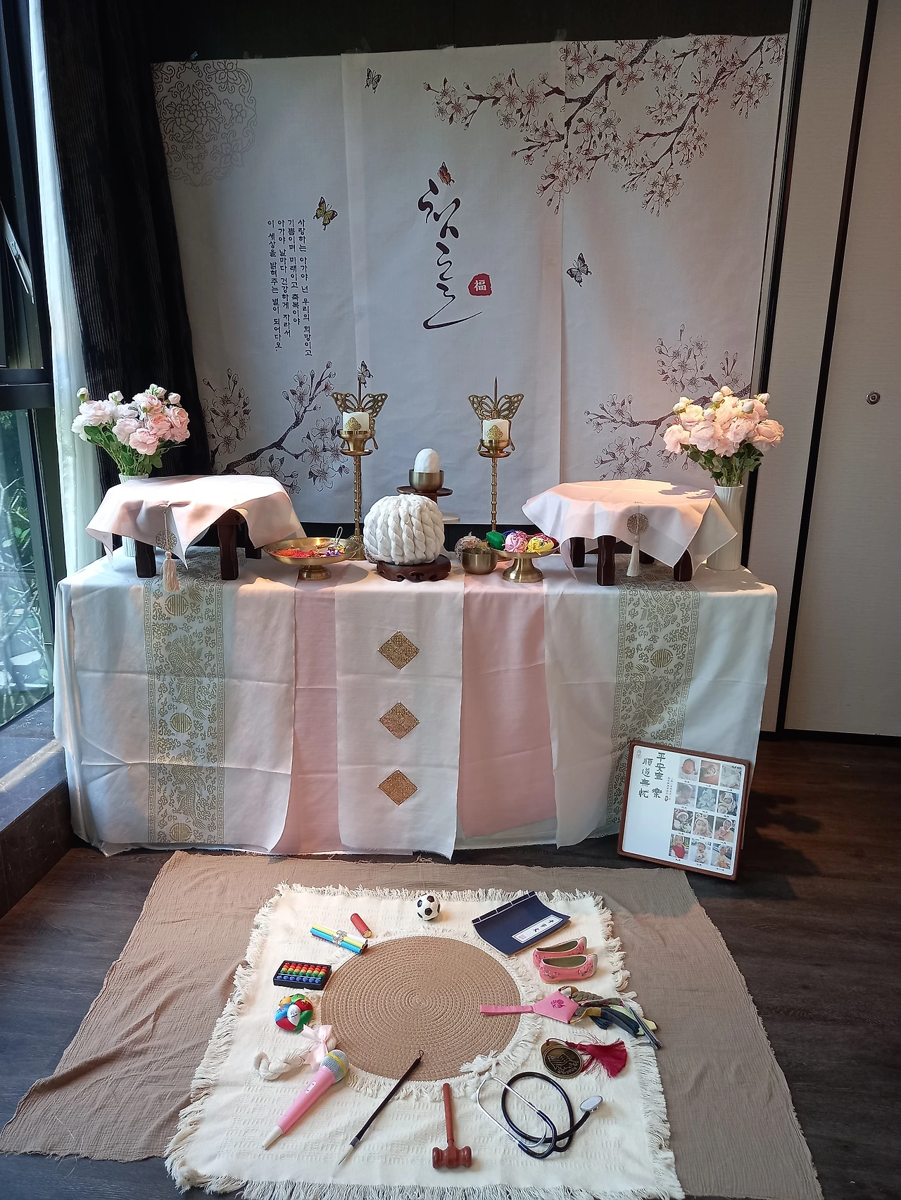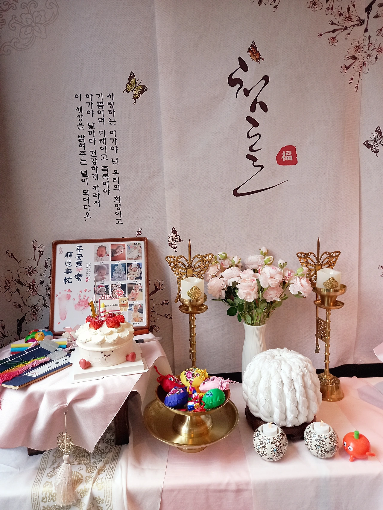 돌상 위에 놓는 것들도 어떻게 놓는 것인지 사진만 보고는 알아보기가 어렵다. 이렇게 놓았다가 저렇게 놓았다가 해본다. 결합해야 하는 것들도 있는데, 직감으로 맞춰본다. 돌상 위에 까는 천도 여러 장이라 순서가 있다. 처음에는 낯설어서 어려운데 점차 익숙해진다. 스스로 터득하는 게 이런 거구나 싶다. 같은 물건을 가지고 만지작만지작거리면 사용법을 저절로 알게 되는 것과 비슷하다. 사람의 지능과 인지 능력의 대단함이다. 드디어 돌상이 완성되었다. 뿌듯하다.