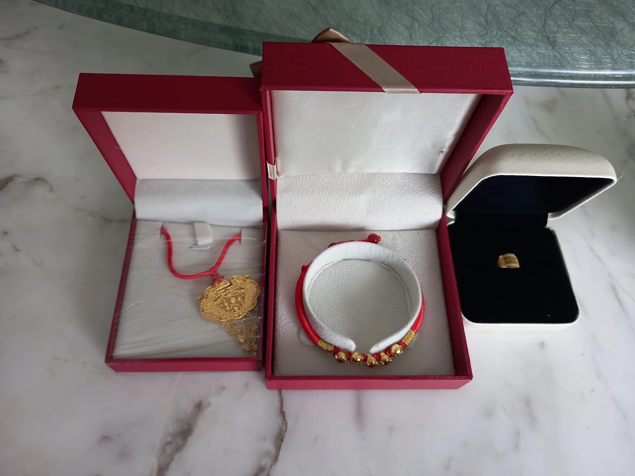 시부모님과 부모님, 우리가 해온 돌 선물 금목걸이, 금팔찌, 금반지를 돌상 위에 올려놓는다.