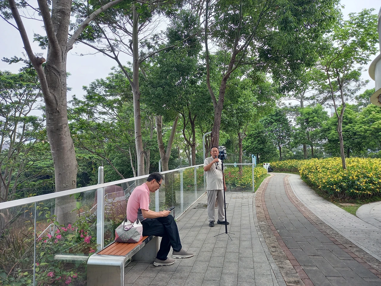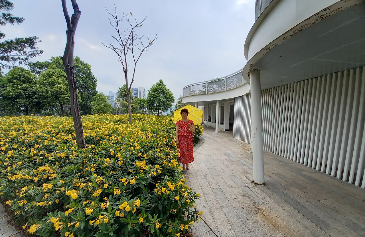 높은 전망대로 올라간다. 철계단이 꽤나 높이 놓여있다. 철계단 밟는 소리가 경쾌하다. 계단 옆으로는 노란 꽃들이 피어있다. 이름은 모르지만 꽃이라서 예쁘다. 계단 끝으로 올라서니 노랑 꽃밭에 베토벤 흉상이 있고 중국어로 노래를 부르는 사람이 있다. 울 남편은 독학한 중국어 실력을 테스트해 본다. 노래하는 이에게 자꾸 말을 걸어본다.