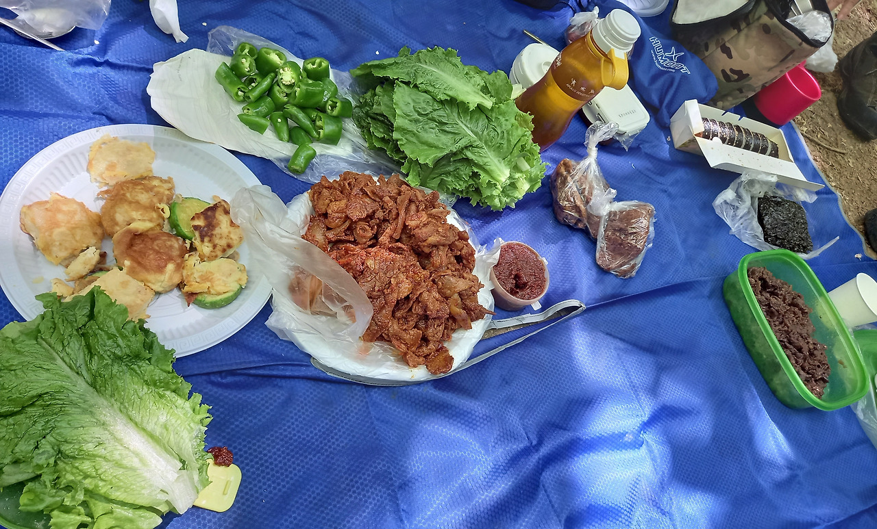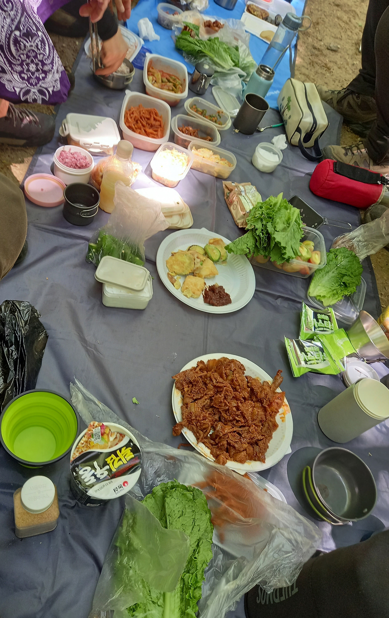 널찍한 장소를 찾아 모여 앉아서 점심식탁을 차린다. 배드민턴 클럽 회원들이 배드민턴을 치는 장소 같다.