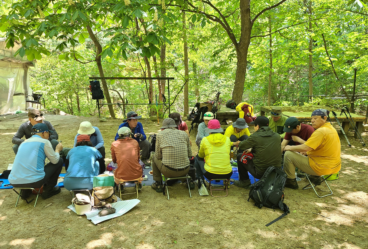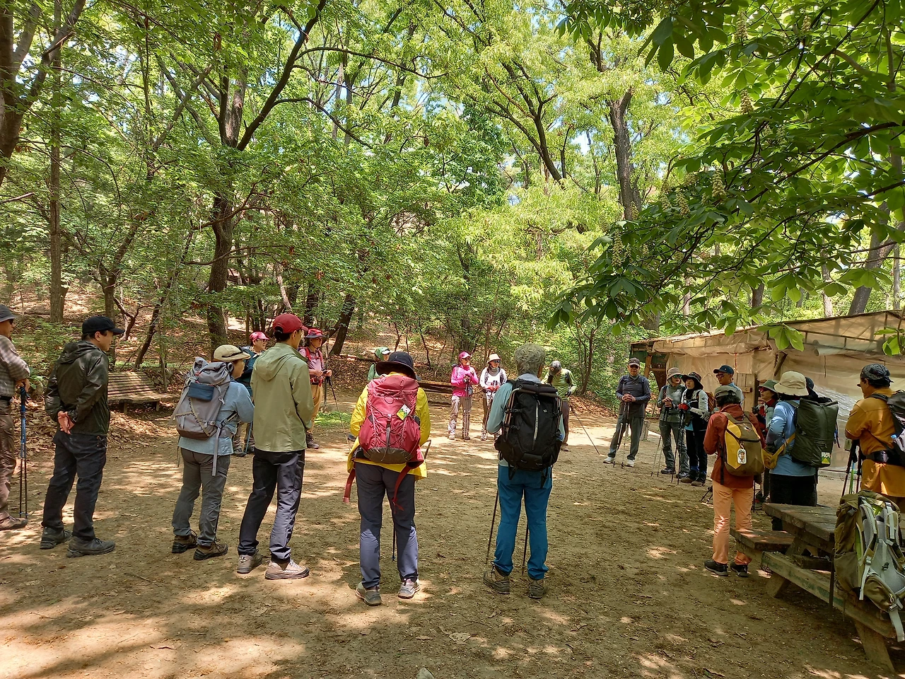 맛난 점심 먹고 빵빵해진 배를 두드리며 서로 인사하고 단체사진을 찍는다. 출발! 본격적인 산행 시작이다! 총인원은 26명이다. 앞서거니 뒤서거니 하면서 도란도란 녹음이 짙은 산길을 걷는다. 날씨는 최적이다. 덥지도 춥지도 않고 바람도 솔솔 불어준다. 하늘은 미세 먼지 없이 쾌청하다.