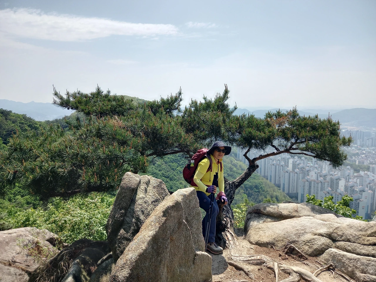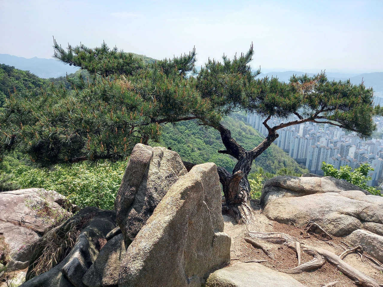 안심하고 다들 부지런히 하산한다. 호암산도 암릉이 꽤나 멋진 산이다. 가다가 암릉 위에서 풍경 조망도 하고 사진도 찍느라 발걸음이 자꾸 멈춰진다. 암릉 위에 기이하게 자란 멋진 소나무 위에서도 포즈를 취한다. 암릉에서는 조심조심 한 발 한 발, 좋은 길에서는 거의 달리다시피 걷는다.