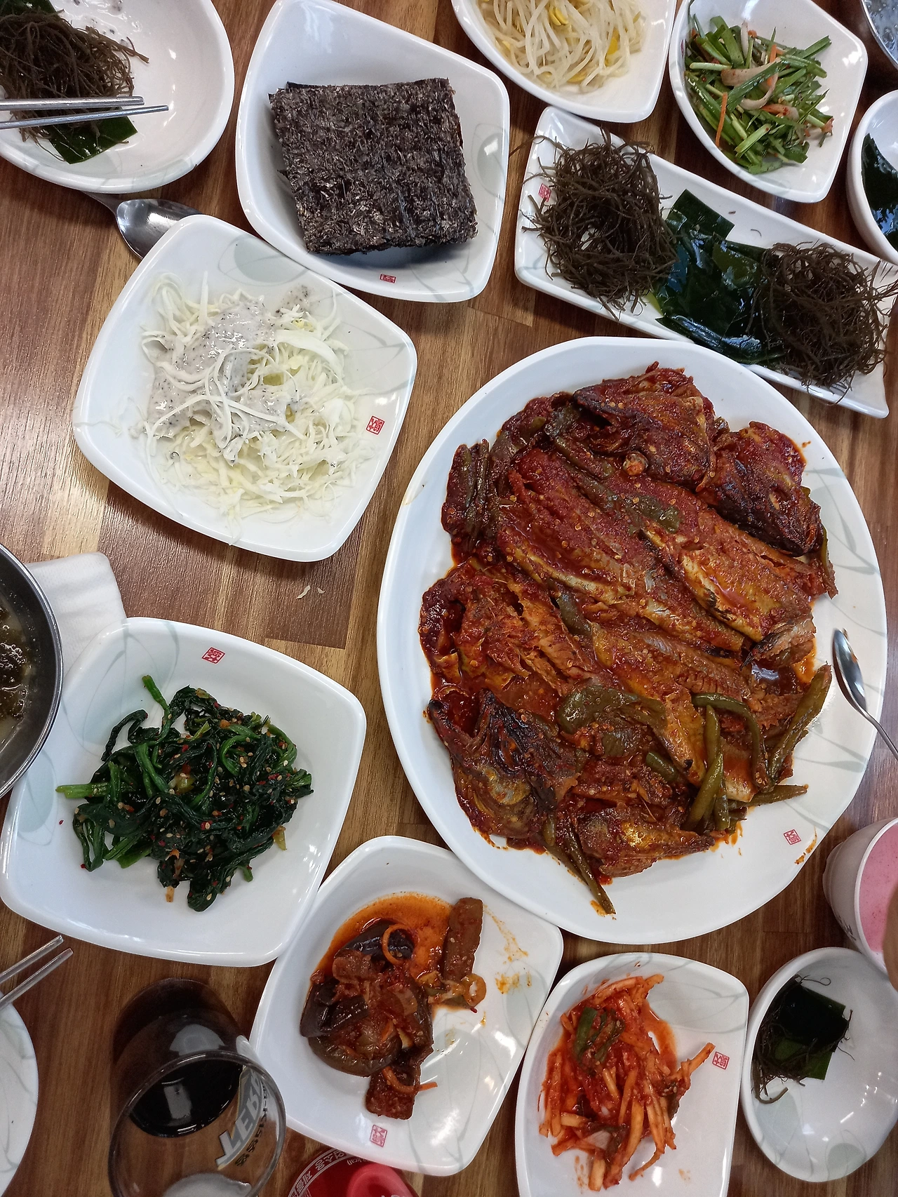 한 사람이 한 마리씩 먹는다. 한 테이블에 앉은 나와 아매랑님은 술을 안 마셔서 콜라 한 캔을 반씩 나누어 마시고, 마운틴님과 지수님은 막걸리 한 병으로 나누어 마시고, 밥은 따로 안 먹는다. 점심에 얼마나 많이 먹었던지 배가 다 안 꺼졌는 데도 또 맛있게 먹는다. 코다리 머리 부분을 남겨서 아깝다고 아쉬워한다. 밥 한 공기 뚝딱 할 수 있는 양인데 말이다.