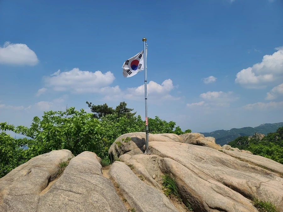 정작 칼바위 능선은 칼바위 국기봉이 있는 곳이다. 암릉 위에 태극기가 늠름하게 휘날리고 있다. 올라가서 기념샷을 남긴다. 오늘의 하이라이트는 단연 칼바위 국기봉이다.