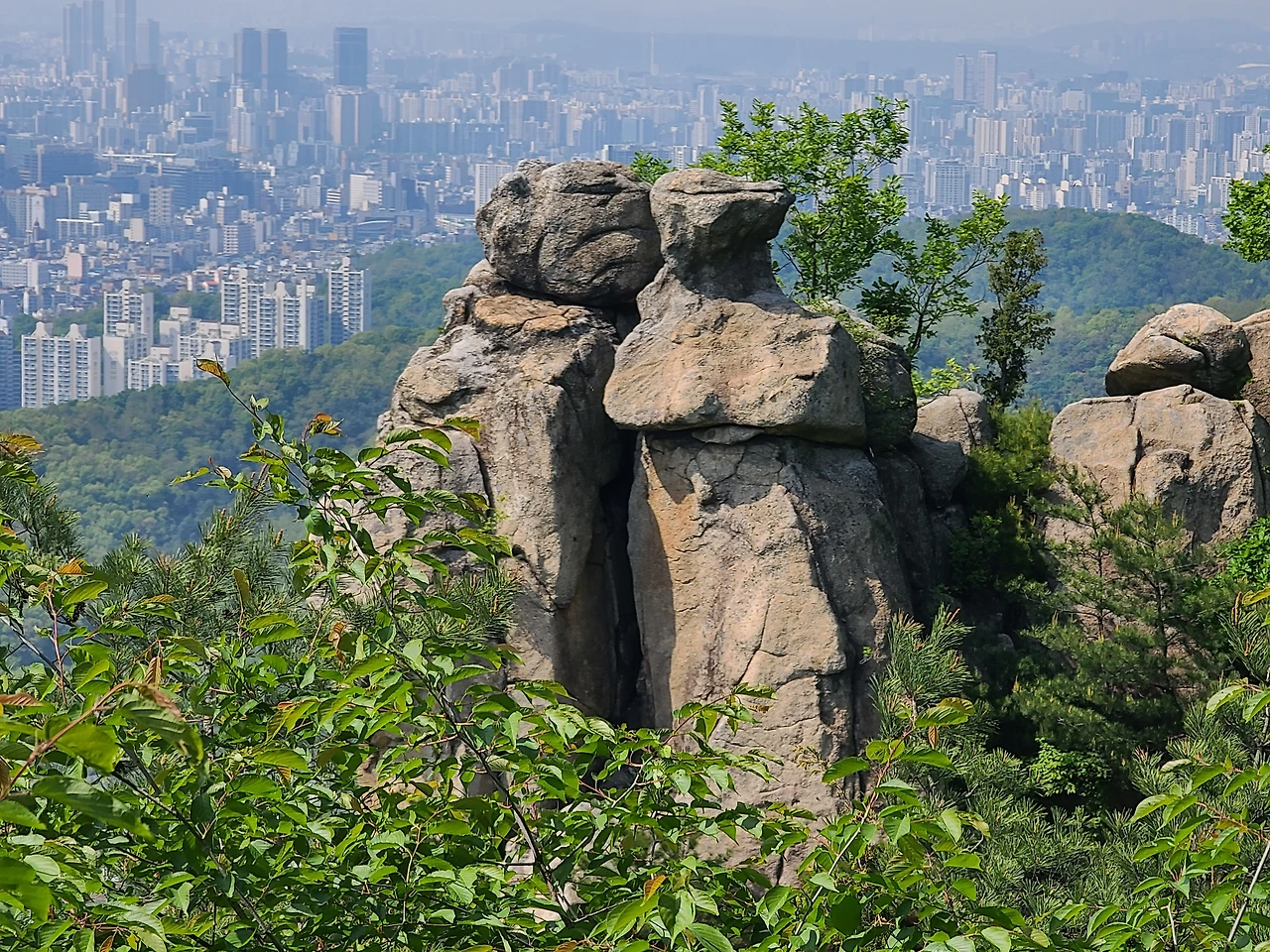 신랑각시바위(사랑바위)가 아주 멀리 보인다. 나무에 가려서 형상을 제대로 알아볼 수가 없다. 그저 그러려니 하면서 사진에 담는다. 그런데 이건 사랑바위가 아닌 모양이다. 꼼꼼하신 기록맨 아매랑님이 올린 후기를 보니 그렇다.
