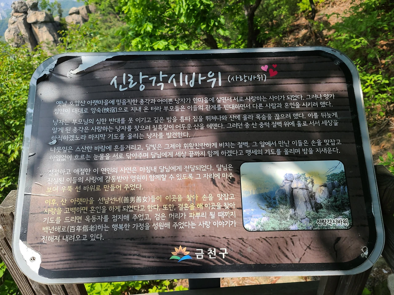 내려가다 보니까 아주 가까이서 신랑각시바위를 볼 수 있는 지점이 나온다. 전망대로 가서 조망한다. 신랑각시가 정답게 나란히 서서 어깨를 맞대고 있다. 자연이 빚은 명 조각품이다. 역시나 이루어지지 못한 사랑 이야기이다.