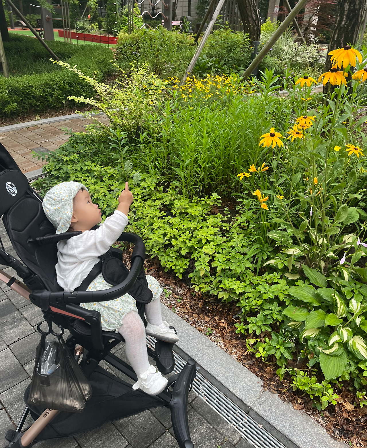 밖으로 나가는 것을 어찌나 좋아하는지 하루 두세 번씩 산책을 한다. 유모차를 타고 가기도 하고, 띠를 매고 안고 가서 걸음마를 시키기도 한다. 엄마나 내 손을 붙잡고 한 걸음 두 걸음 걷는 모습이 사랑스럽다. 붙잡고 있는 손을 놓으면 한두 발자국 떼다가 이내 주저앉는다. 아직 혼자 걷는 건 자신이 없나 보다.
