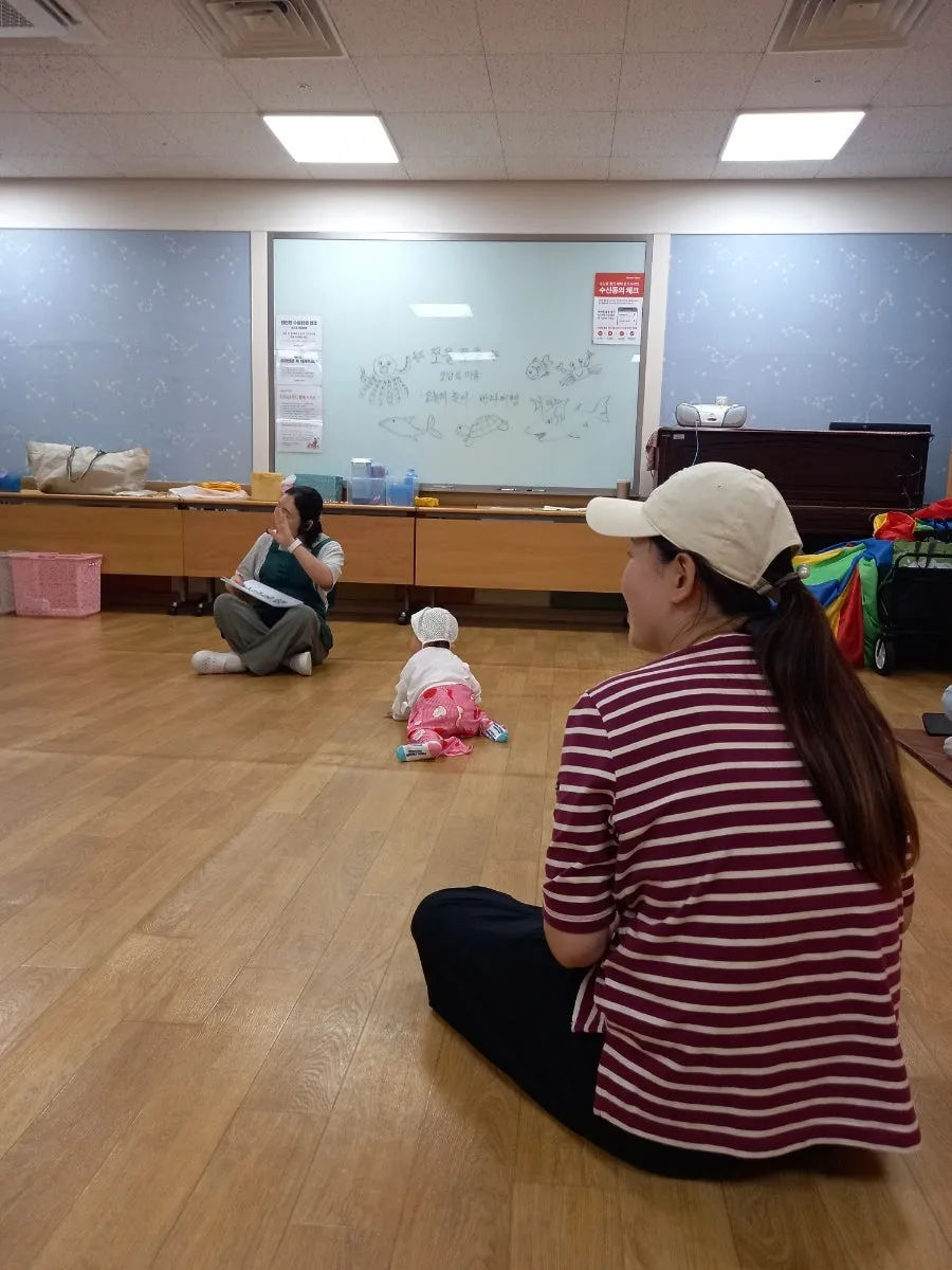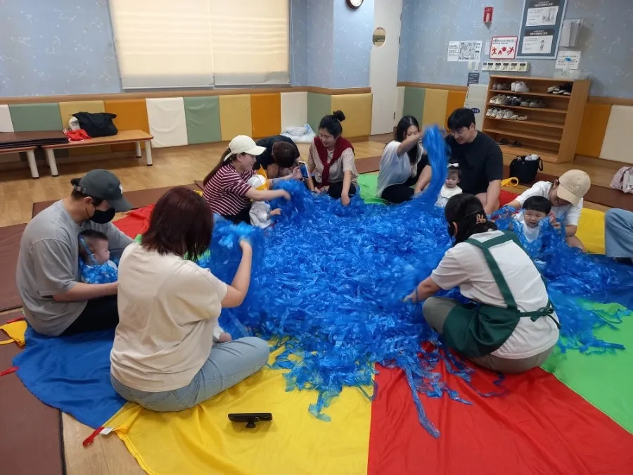 울 딸과 나, 외손녀가 오감놀이 체험을 했는데, 울 외손녀는 거침없이 앞에 있는 선생님에게로 기어서 다가간다. 가까이에서 호기심이 가득 찬 눈으로 놀이 설명을 하는 선생님을 쳐다본다. 놀이가 시작되면 신나게 참여한다. 바다놀이, 악기놀이, 낚시놀이 등을 했는데, 양손으로 파도를 철썩이게 하기도 하고, 채를 들고 악기를 두드리기도 하고, 낚싯대로 물고기를 잡기도 한다.