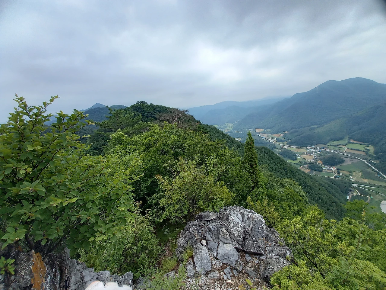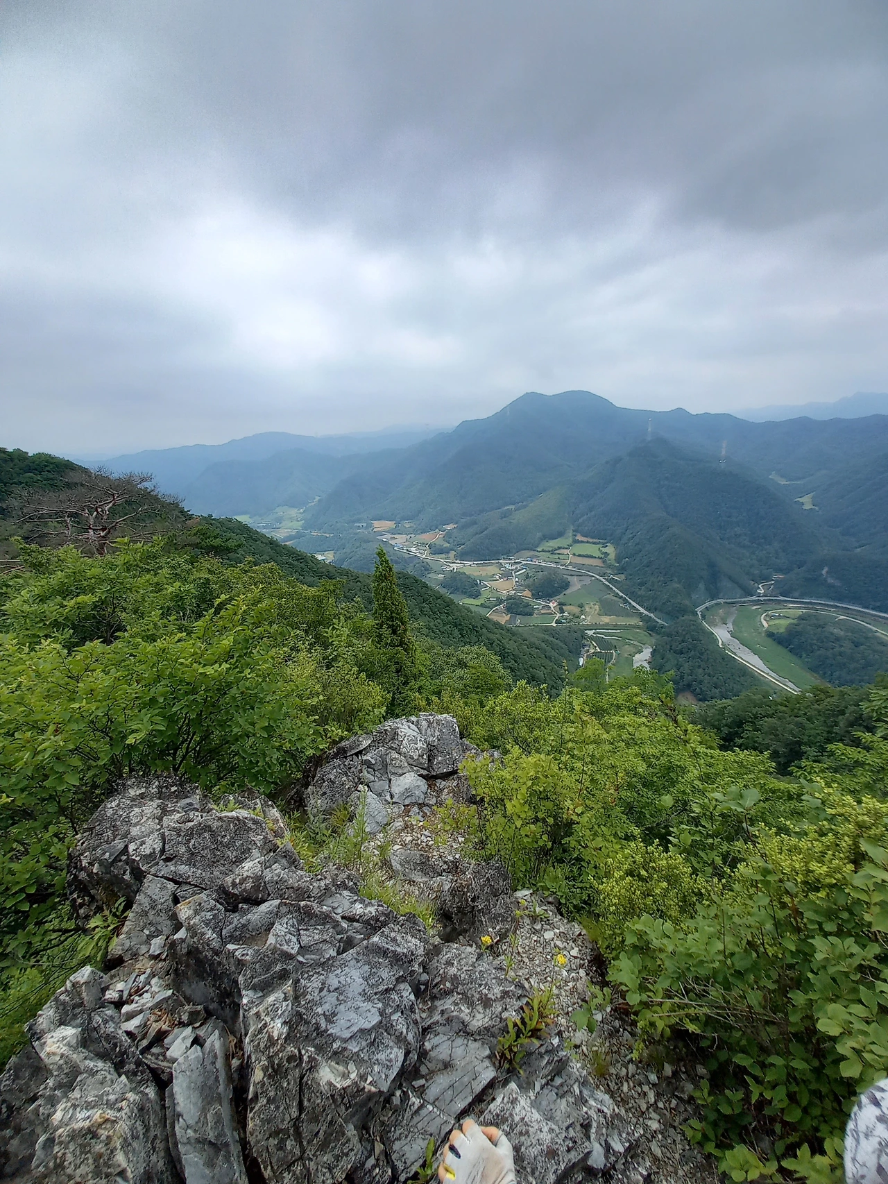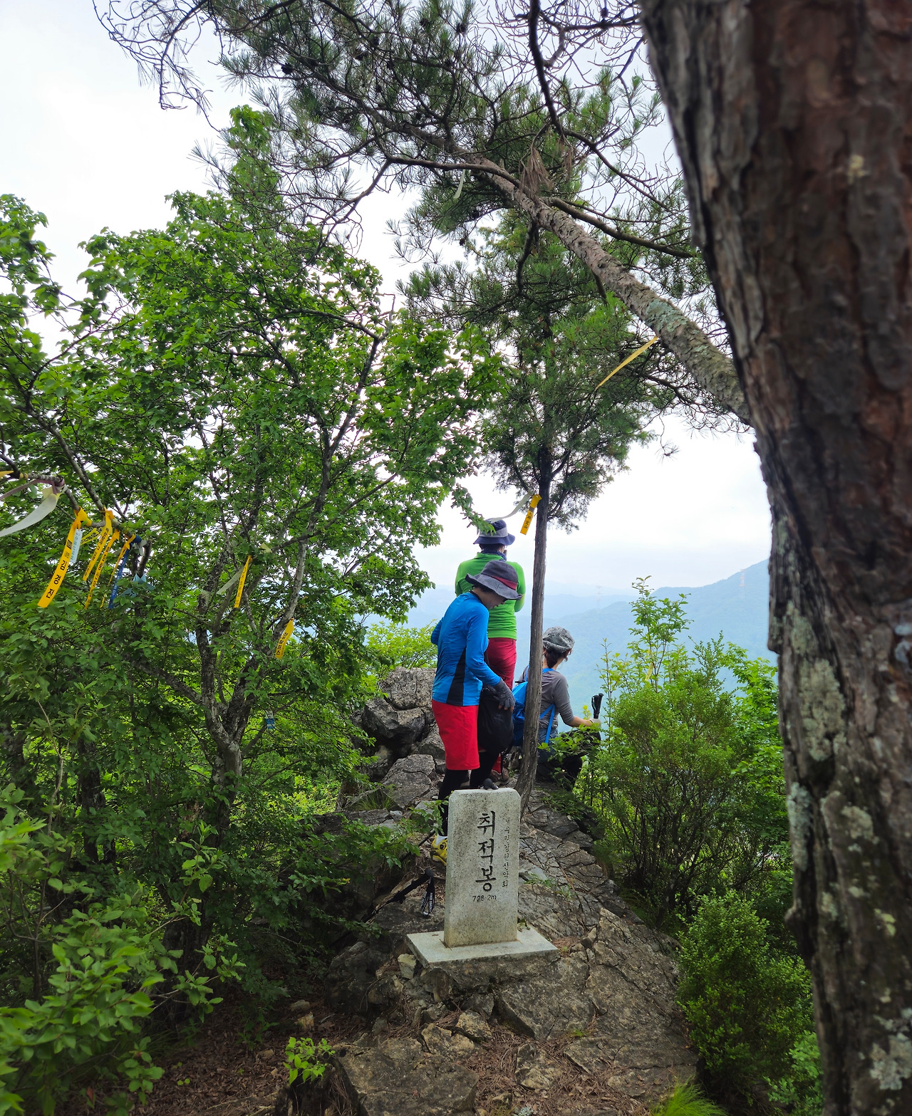 취적봉은 작고 아담한 정상 돌비가 서 있다. 돌비 뒤쪽으로 멋진 풍경이 펼쳐진다. 우뚝 솟은 봉우리들, 논밭과 마을, 구불구불 덕산기 계곡이 흐르고, 암릉 위에는 고사목도 보인다. 정상 돌비에서 기념사진만 찍고 가는 이들도 있지만 호기심이 많은 산우님들은 돌비 뒤쪽으로 가서 멋진 풍경을 감상한다. 나도 호기심파이기에 따라가서 흐뭇한 표정으로 풍경을 감상한다. 정상에서 보는 뷰는 남다르다. 높건 낮건 산 정상은 그 어디나 제일 높은 곳이니까 오른 자만이 볼 수 있는 풍경이기 때문이다.
