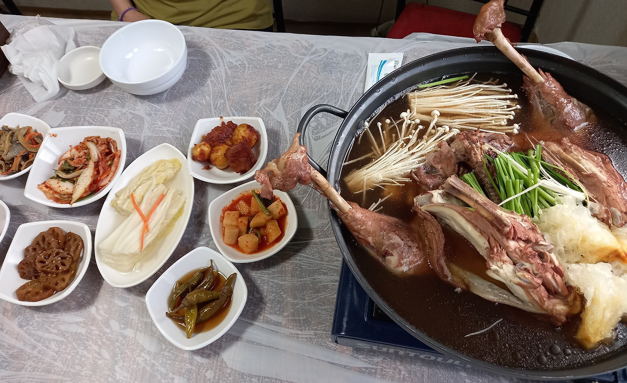 오후 3시 20분 버스를 타고 월통휴게소로 간다. 그곳에서 한방닭백숙과 오리백숙으로 뒤풀이를 한다. 4인 테이블에 한 마리씩 먹는다. 담백하니 맛이 있다. 아까 덕산기 계곡에서 먹은 수박과 함께 한방 백숙은 올여름 보양식이다. 홍윤님 생일케이크가 후식으로 나온다. 맛깔스럽게 입가심하고 귀경길에 오른다.