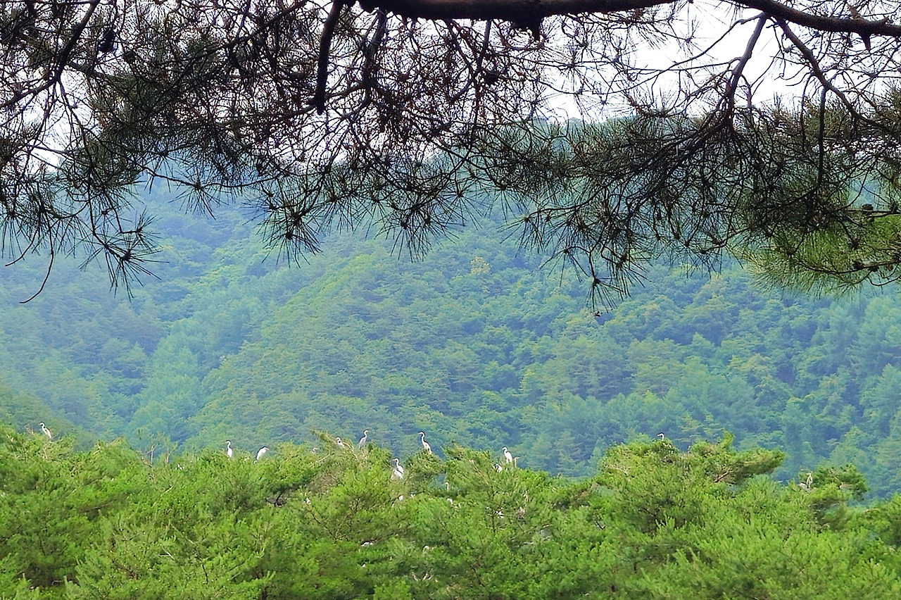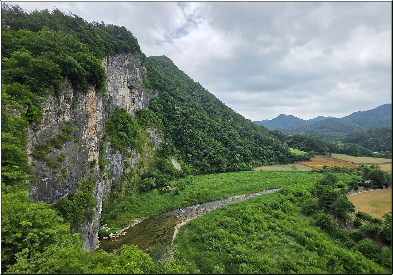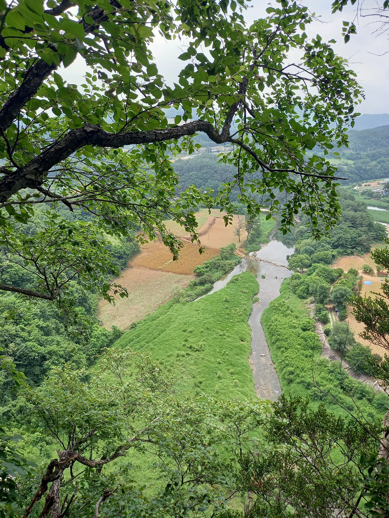 하산하다 보니 깎아지른 듯한 절벽이 보인다. 우리가 바로 그 옆 암릉길로 걸어서 내려왔던 것이다. 절벽을 쳐다보니 아찔하다. 계룡산도 암릉길 따라 걷는데 그 옆은 바로 천길 낭떠러지 절벽이다. 취적봉 암릉길은 계룡산보다 덜 험하지만 절벽 아래가 바로 덕산기 계곡이라는 게 좋은 점이다. 길게, 구불구불, 반달형으로 계곡이 조금씩 달라져 보이는데, 나뭇가지와 어우러진 계곡의 모습을 보면서 걷는 재미가 있다.