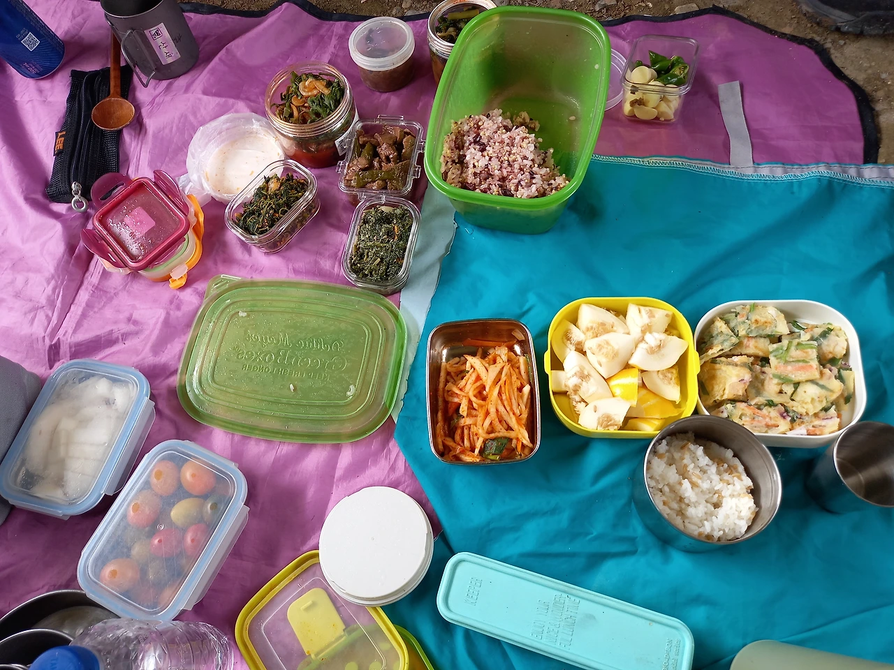 시간이 1시 30분이 넘어서 나는 배가 고팠기에 밥부터 먹을 생각에 배낭을 열어 싸 온 도시락을 꺼낸다. 산을 안 오른 이들은 이미 식사를 다한 듯했고, 함께 산을 올랐던 산우님들이 돗자리를 펴고 맛깔스러운 음식들을 꺼내놓는다. 반찬 나물을 4~5가지씩 싸 온 이들도 있다.