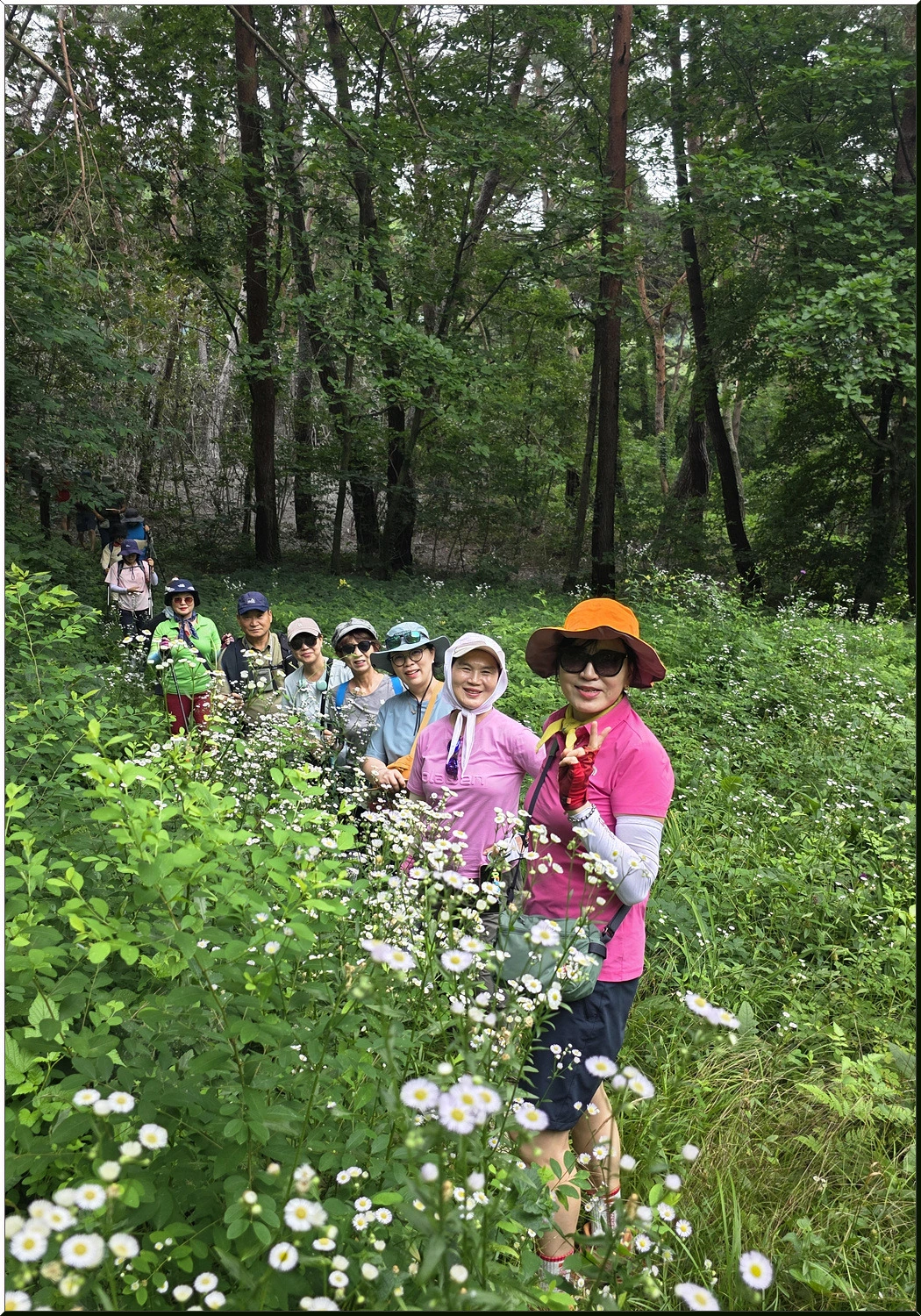 오전 10시 30분 정선 석공예단지 주차장에 도착한다. 일부는 바로 덕산기 계곡으로 갈 거라서 차 안에 있고, 일부는 취적봉을 오르기 위해 내린다. 머털도사 고문님이 '배낭은 차에 두고 가볍게 하고 가라'라고 해서 작은 가방 하나만 어깨에 메고 물을 넣고, 스틱을 꺼내서 가지고 간다. 취적봉 팀은 덕산기 계곡 옆 도로길을 걸어서 고추밭길로 들어선다. 밭길 끝에 하얀 개망초꽃이 무리 지어 피어있다. 꽃길에서는 다 함께 꽃이다.
