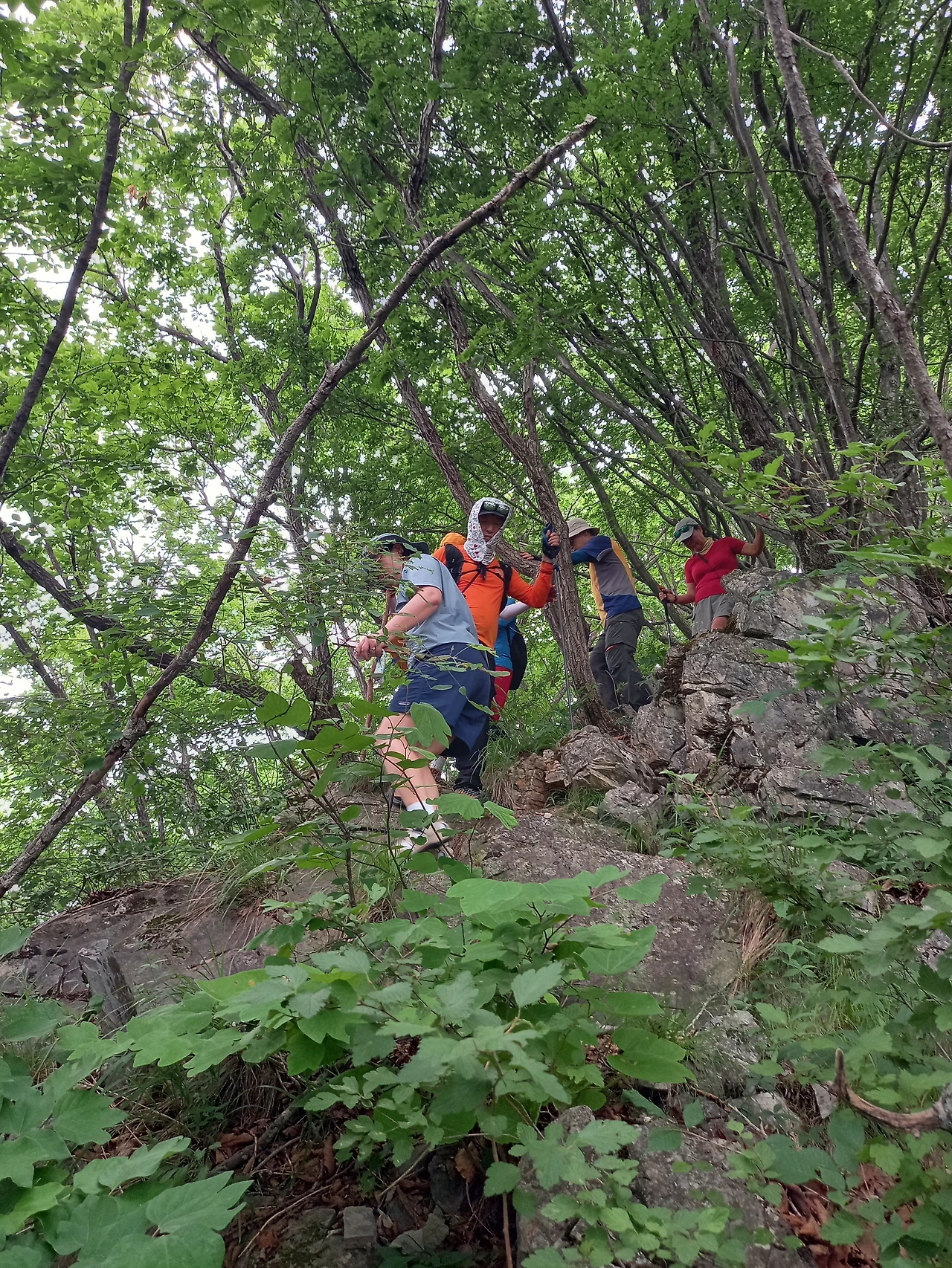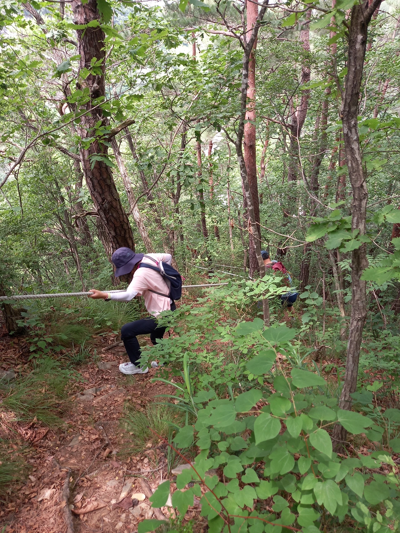 암릉길 멋진 암릉 위에서 지나온 암벽을 배경으로 사진 찍는 재미도 쏠쏠하다. 로프나 릿지 기구를 이용해서 90도 각도 암벽을 올라본 경험은 없지만, 바위 좋아하시는 리딩 대장님을 따라서 도구도 없이 불암산 영신바위 1구간 90도 암벽을 올라본 적은 있다. 그때 어찌어찌해서 바위 홈을 타고 반쯤은 올라갔는데, 중간에 올라갈 수도 내려갈 수도 없는 지경에 처하고 말았다. 손바닥과 무릎도 다 까지고 아래를 내려다보니 '떨어지면 크게 다치겠구나!' 싶어서 간이 서늘했다. 그때 위에서 남산우 님 한 분이 휴대하고 다니던 자일을 내려주어서 잡고 간신히 올라갔다. 하산길 옆으로 펼쳐진 거대한 암벽을 바라보니 그때 기분이 되살아나 무서워서 눈을 질끈 감아본다.
