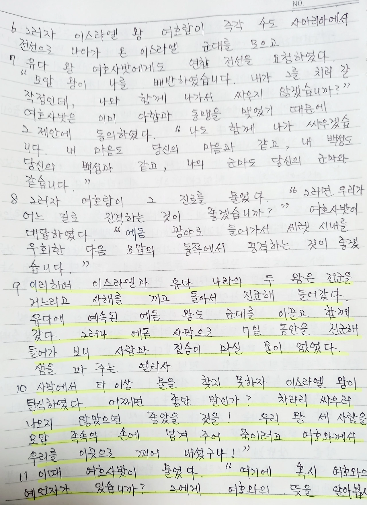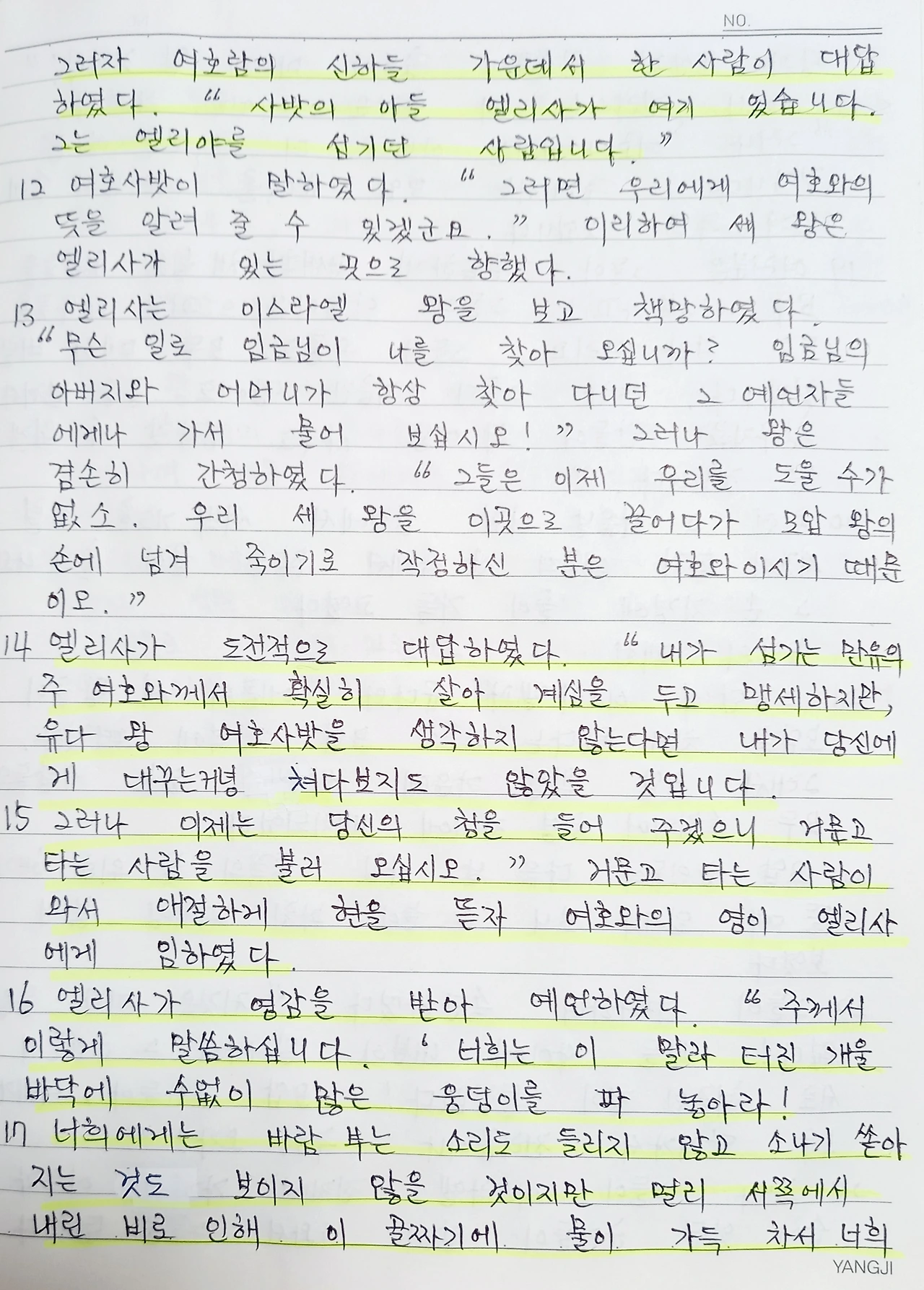 "이 말라 터진 개울 바닥에 수많은 웅덩이를 파 놓아라. 이곳에서는 바람 부는 소리도 소나기 쏟아지는 것도 보이지 않지만, 멀리 서쪽에서 내린 비로 이 골짜기들이 가득 차서 넘칠 것이다. 왕과 군인과 짐승들이 물을 충분히 마시게 될 것이다."