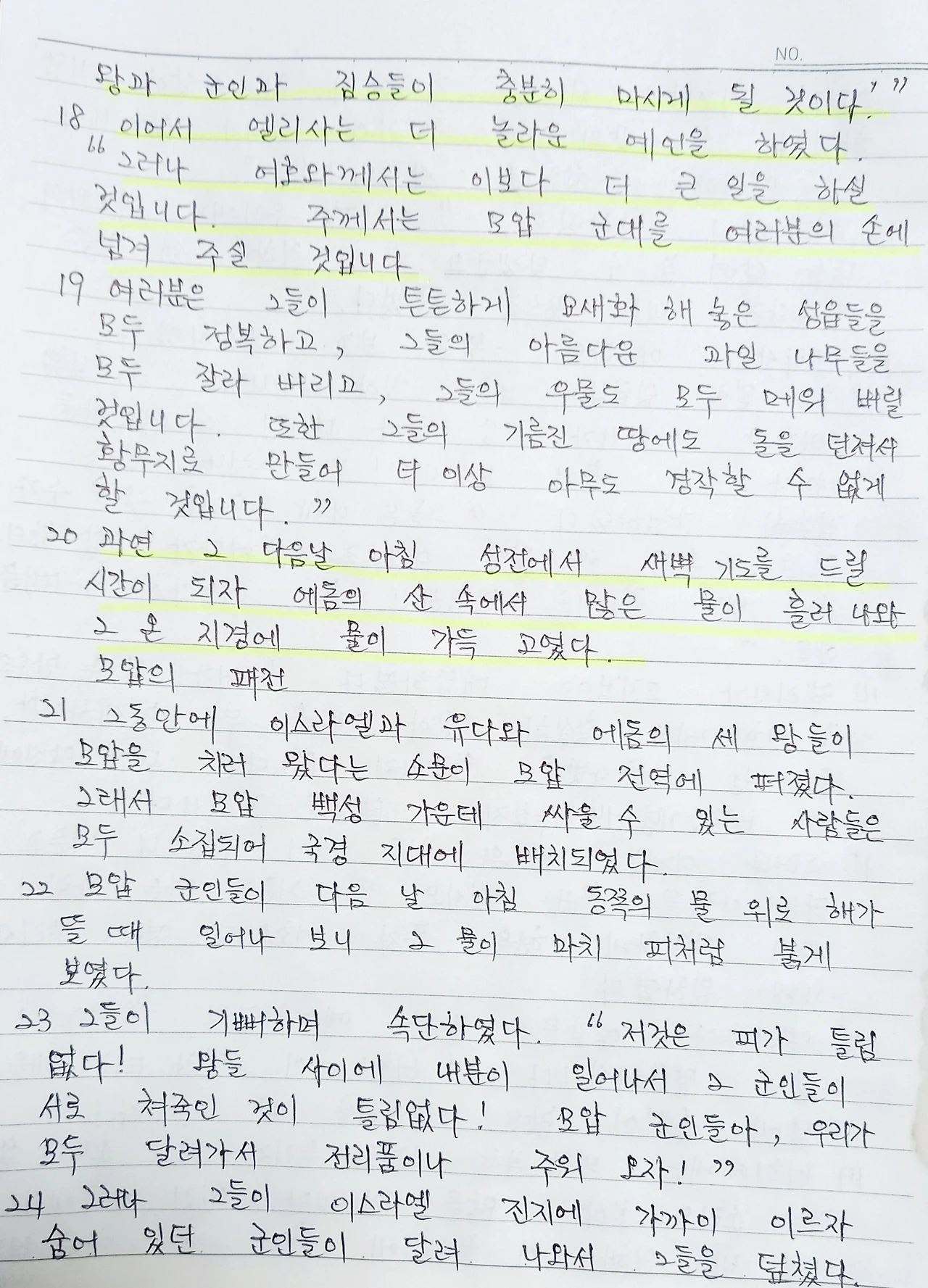 그뿐이 아니다. 여호와께서는 더 큰 일을 행하셔서 모압을 세 연합군의 손에 붙이신다. 다음 날 아침 동쪽 물 위로 해가 뜨자 그 물이 피로 보이는 것이다. 모압 사람들이 착각을 하여 세 왕들이 저희들끼리 싸워서 흘린 피인 줄 알고 전리품을 챙기러 온다. 그러자 매복해 있던 연합군이 모압군을 공격하여 초토화되고 만다. 성읍을 다 헐고, 농토도 돌을 던져 황폐화시키고, 모든 샘을 메우고, 과일나무도 다 베어버린다. 더 이상 사람이 살 수 없는 땅을 만들어버린 것이다.