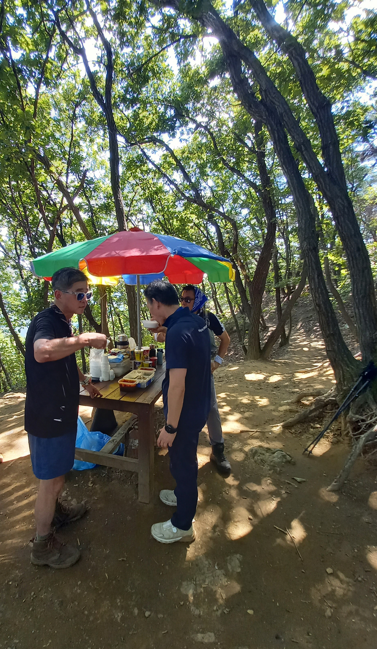 곧 숲 속 주막에 이른다. 막걸리와 음료수 등을 팔고 있다. 대장님과 남산우님 두 분은 이곳에서 시원한 막걸리를 한 잔씩 하고, 나는 포카리스웨트 캔을 마시며 잠시 쉬어간다. 가만히 서 있으면 바람도 간간이 불어 주어 시원하다.