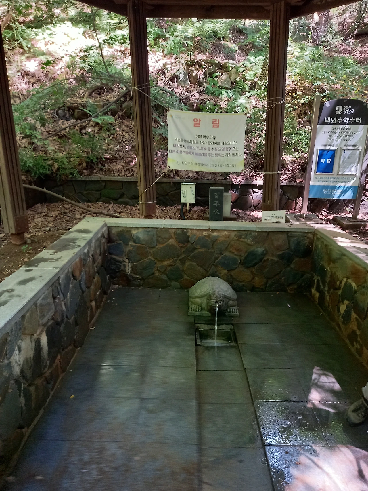 광교산 산길은 살방살방 걷기가 좋은 육산에 그늘길이다. 곧 천연 약수터 백년수가 나타난다. 시원한 물을 두 바가지나 받아서 마시고 기념삿도 찍어본다. 이곳에도 베스산 안내지를 놓아둔다. 참 지극정성이다. 이 더위에 산 오르기도 힘든데, 자신이 맡고 있는 산악회 홍보를 위해 일하는 대장님 모습이 아름답다 여긴다. 어느 산악회이든지 봉사하고 섬기는 이들이 있어야 부흥발전을 한다. 현재 베스산 가입 회원은 85명인데, 매주 2~3명 정도씩 꾸준히 회원이 늘고 있다. 나는 좀 쉬운 산악회와 집결지가 집 근처인 산악회를 찾던 중 검색해서 알게 된 것이지만, 나와 함께 버스에서 내린 남산우님은 광교산에서 그 안내지를 보고 알게 되었단다. 그이도 이곳에 온 지는 얼마 안 되었단다. 한 두 주 전에 가입하고, 7월 셋째 주 정기산행으로 소똥령과 라벤더 팜에 다녀오고 이번이 두 번째 산행이란다.
