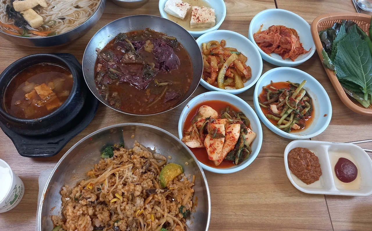 뒤풀이 장소인 <광교헌 농원> 마당으로 가서 베스산악회 현수막을 들고 오늘의 광교산 산행 인원 6명이 모두 함께 기념샷을 남긴다. 광교산 산행 올 때마다 자주 오던 집이다. 보리밥, 콩국수, 잔치국수를 골고루 주문해서 나누어 먹는데 다 맛있다. 선짓국도 서비스로 나오고 된장국도 구수하다.