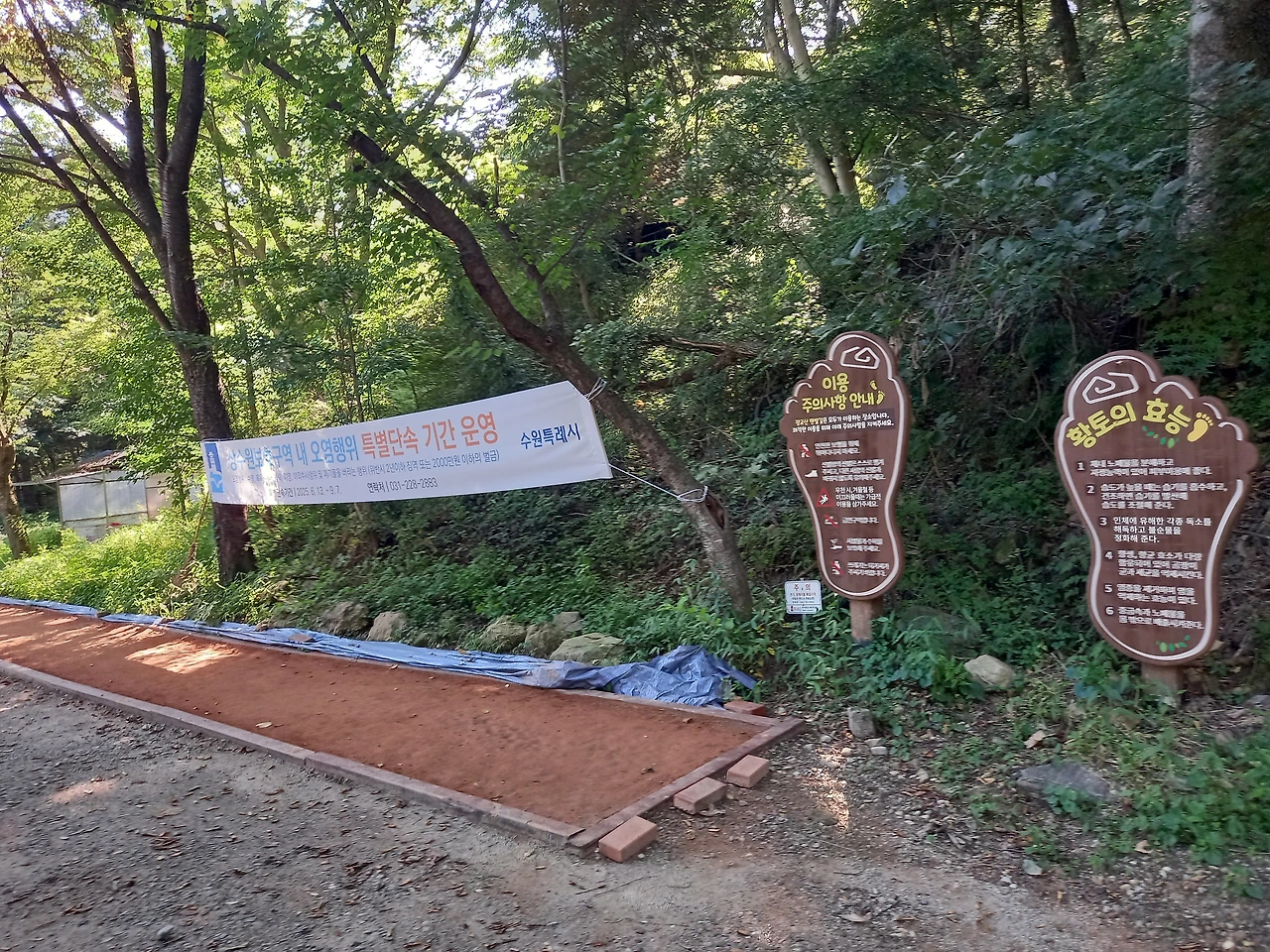 광교산은 하산길에도 상수원보호지역으로 계곡에 들어갈 수가 없다. 그렇지만 황톳길이 있는데 그 끝부분에 발 닦는 수도시설이 있어서 씻을 수 있다. 두 번째 오신 남산우님과 처음 온 나는 신발과 양말을 벗어 들고 황톳길을 걸어서 가는데 날이 더워서 황토가 다 말랐다. 어쩌다 몇 군데 아주 조금씩 진흙이 말랑말랑한 곳이 있어서 거기에 발가락을 꼼지락거려 보고 아쉬워한다. 황토 보관통도 열어 보지만 요즘 같은 폭염에는 황톳길 관리가 쉽지 않을 것 같다.