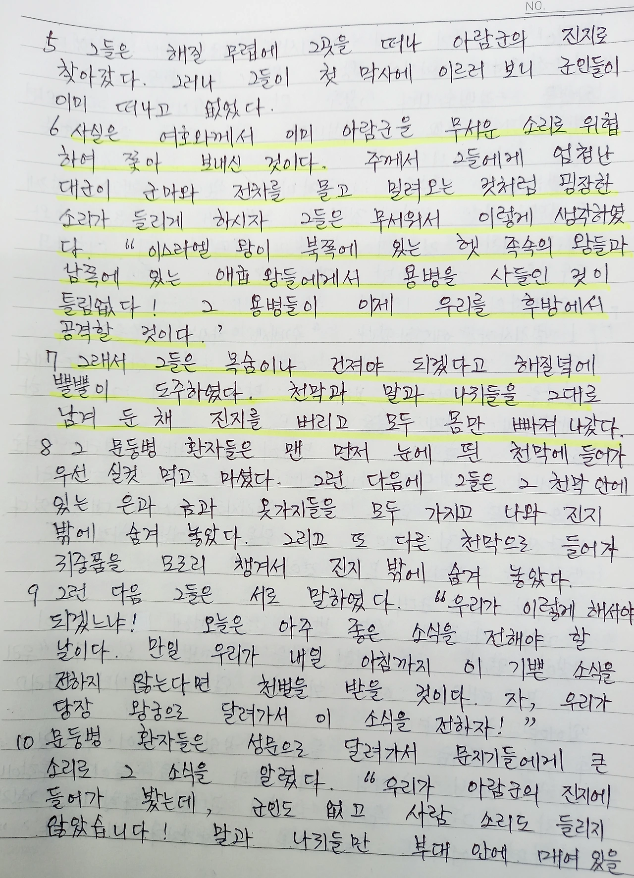 한편 이스라엘을 침공해서 주둔하고 있는 아람 군대는 하나님께서 내는 군마와 병거 소리에 이스라엘이 헷족속과 애굽의 용병을 사서 자기들을 쳐들어오는 줄 알고 진지와 먹을 것과 군마와 병기를 다 내버리고 도망을 간다.