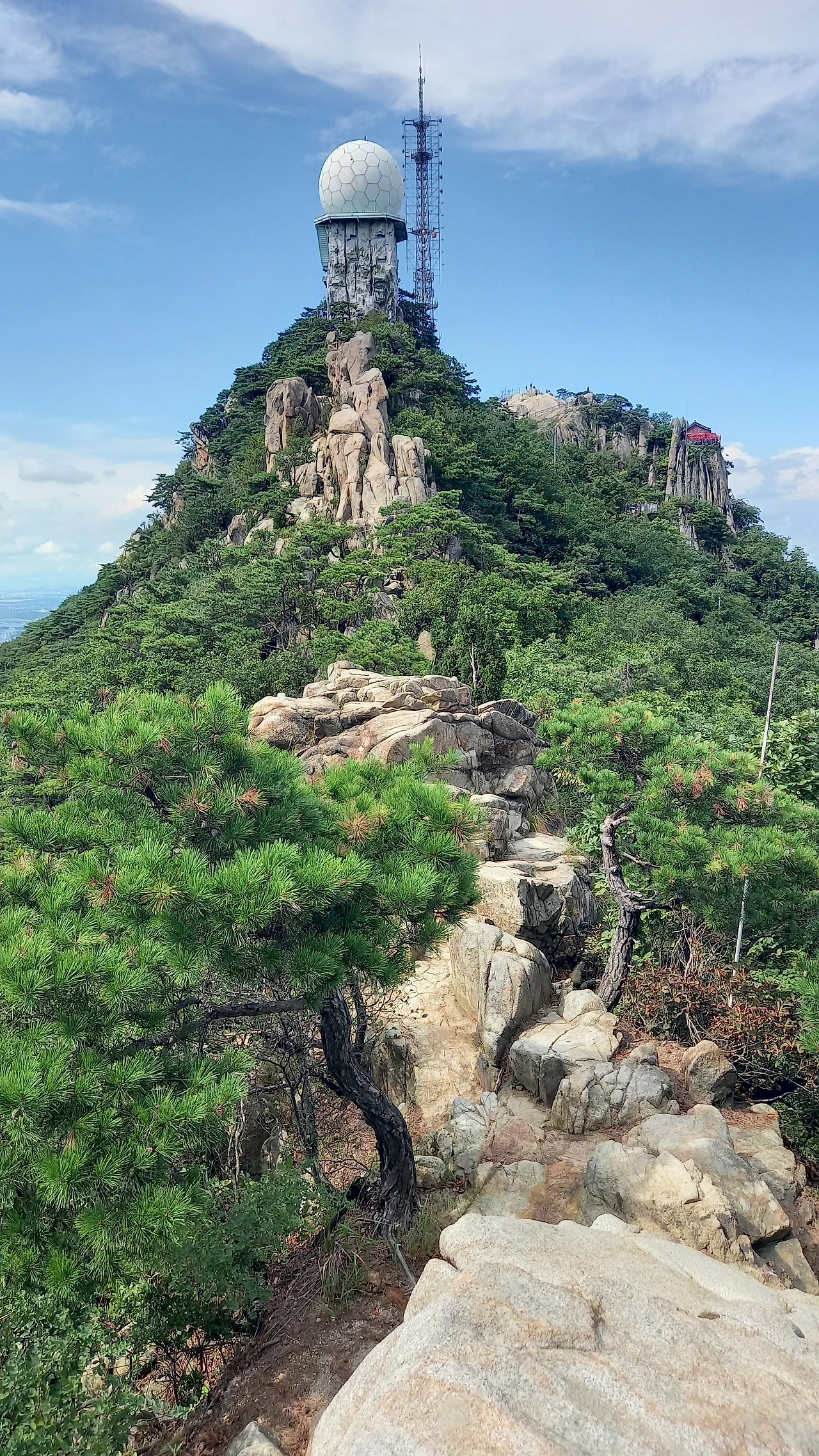 KBS 통신소 지나 연주대가 가까이 바라다보이는 암릉까지 왔다. 저 길로 내려온 적은 있는데 올라가는 건 좀 겁이 난다. 그래서 연주대를 배경으로 사진만 찍고 안전한 계단길로 우회하기로 한다.