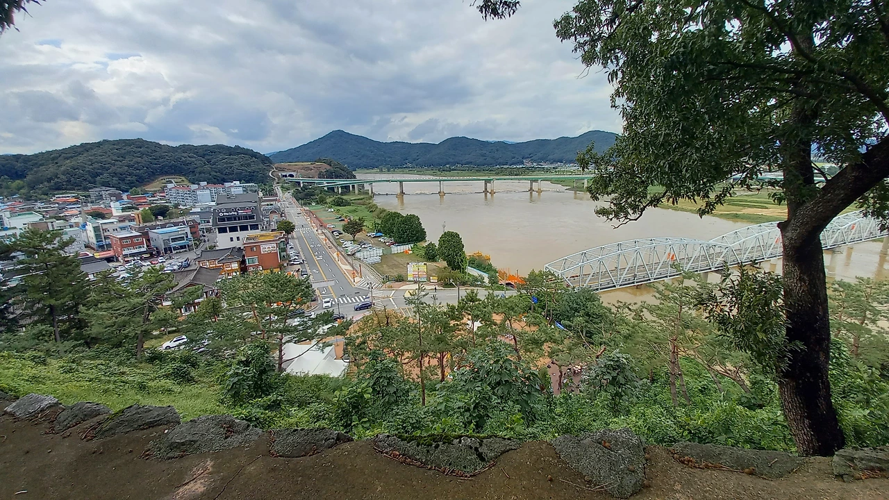 금강 위로 놓인 다리가 두 개 보이고 차들이 휙휙 지나간다.