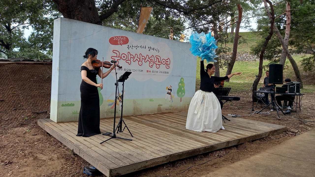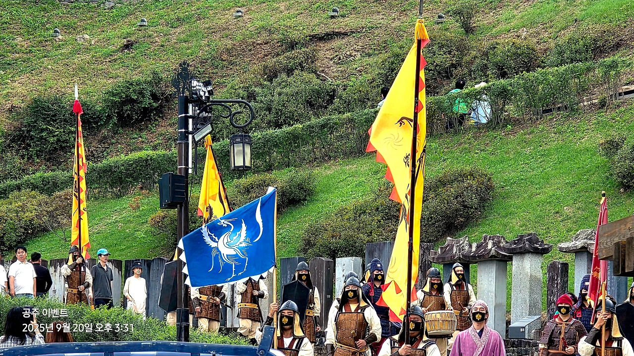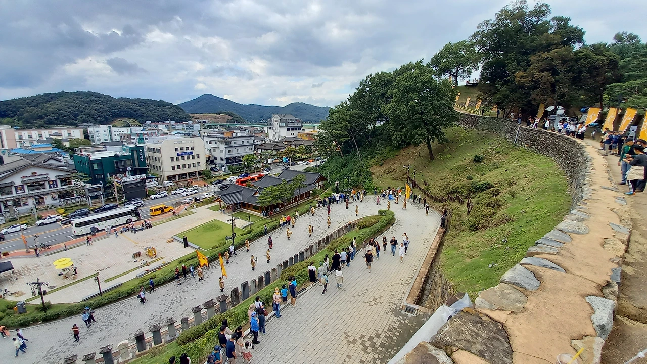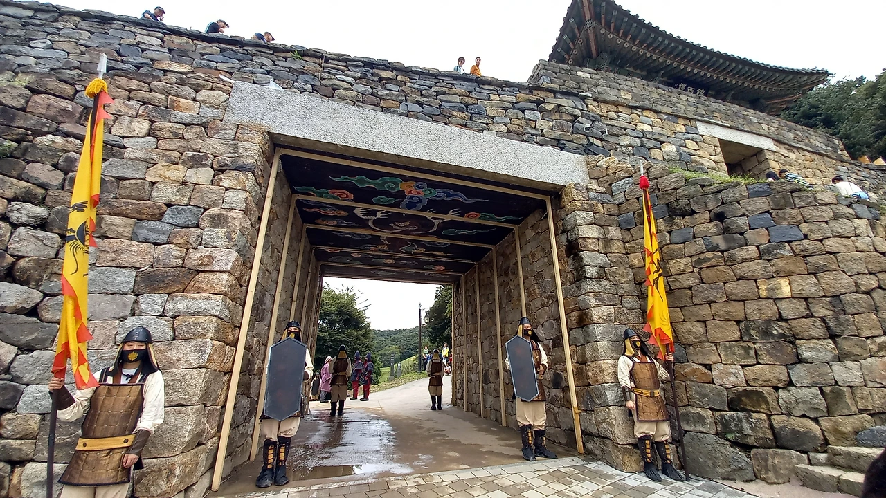 공산성 정문 광장이 시원스레 내려다보이는 지점에서 가파른 계단을 내려오니 아름다운 선율이 흘러나온다. 바이올린과 전자올겐 반주 소리이다. 커다란 고목 아래쪽에 사람들이 모여서 듣고 있기에 나도 합류한다. 까만 드레스를 입은 여자분이 바이올린을 켜고, 전자올겐은 까만 정장을 남자분이 연주하는데, 가운데서 하얀 망사 드레스를 입은 여자분이 음악에 맞추어 하늘하늘 춤을 추고 있다. 파란 꽃을 들고도 앞으로 뒤로 빙그르르 돌면서 춤을 춘다. 공산성에서 펼쳐지는 국악상설공연 장이다. 곡이 무엇인지는 모르지만 다들 집중해서 듣고 사람들이 앙코르를 요청하니까 이선희의 연가를 연주해 준다. 다 듣고 내려오니 공산성 입구 쪽이 악기소리로 요란하다. 수문장 교대식이다. 예전에 남한산성에서 한번 본 적이 있는데, 이곳에서도 우연히 보게 되어 흥미롭다. 발걸음을 멈추고 수문장들이 줄지어서 성곽 문으로 들어와서 교대식 하는 것을 지켜본다. 옛날 격식에 따른 어려운 말로 진행을 한다.