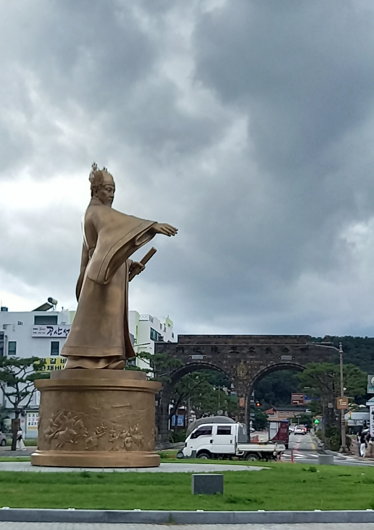 완전히 다 보지는 못하고 내려온다. 시간은 아직 15분 정도 여유가 있다. 버스가 오래 서 있지를 못해서 약속 시간인 3시 30분이 다 될 때까지 서서 기다린다. 공산성 앞 도로 한복판에 우뚝 서 있는 백제 무령왕 동상과 공산성과 무령왕릉으로 가는 문도 다아본다.