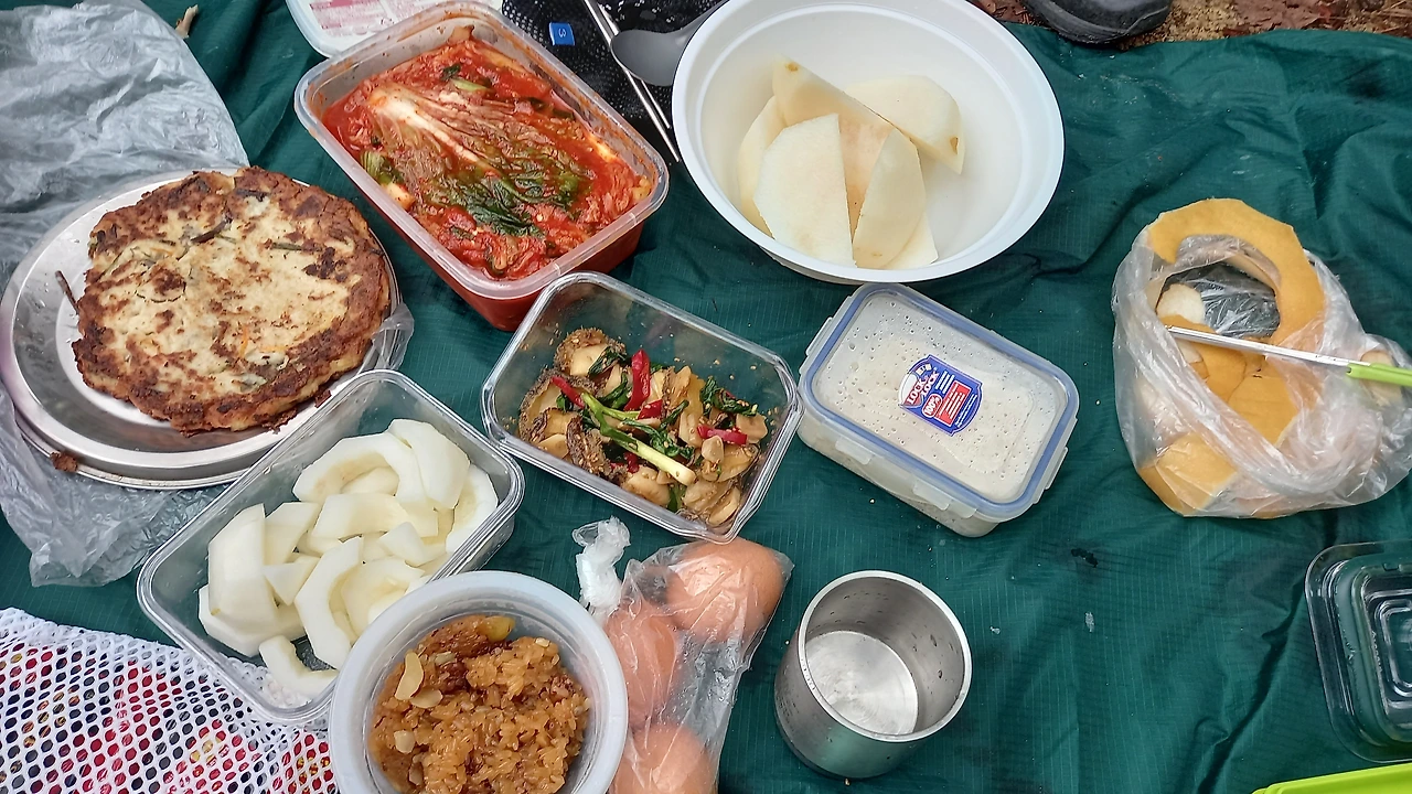 참 남은 음식 버리는 게 아까워서 내가 싸 왔다. 귀한 능이버섯 백숙에 송이버섯 죽을 내일까지도 먹을 수 있겠다. 공지해주신 두야 대장님, 섬겨주신 산골지기님, 맛있는 시간 함께한 산새 자문위원님, 전력님, 모두모두 감사하다. 나중 또 좋은 산길에서 만나길 기대한다.