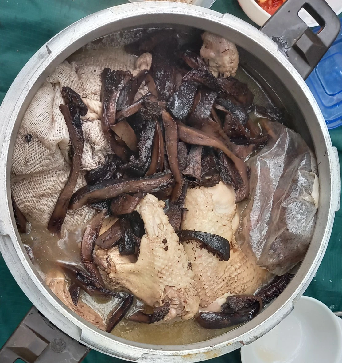 한 30여 분 지나니 치지지이익! 코가 먼저 알아보는 건강식 한약 냄새 능이버섯 백숙 다 되었다는 소리가 난다.