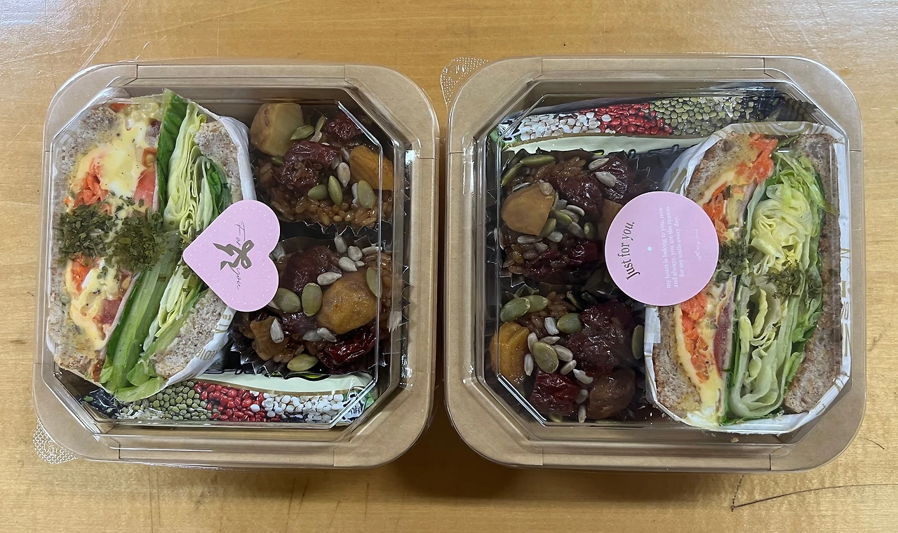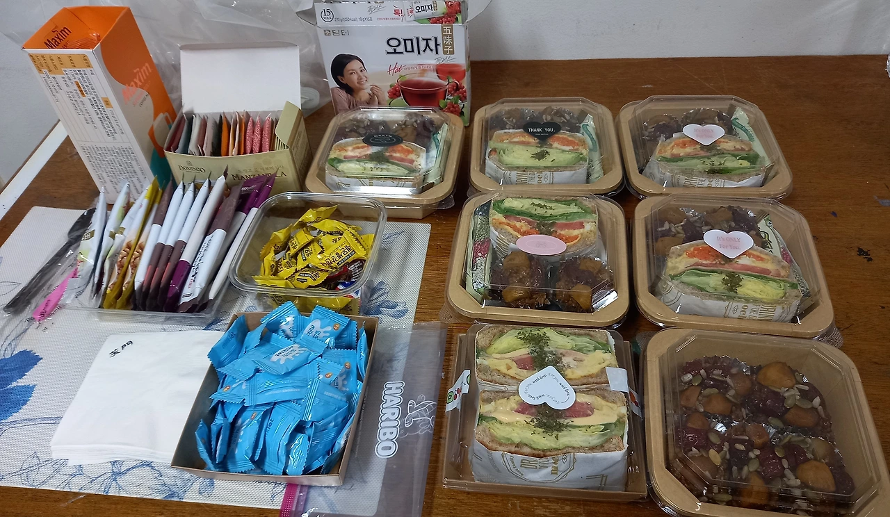 자세히 보니 친구들이 지금 간식타임을 하고 있다. 바로 정성 가득한 문미정표 샌드위치와 약밥, 쿠키가 들어있는, 너무 예뻐서 차마 먹기 아까운 간식을 먹으며 즐거운 시간을 보내고 있다. 나도 얼른 내 몫을 챙겨서 맨 끝자리에 앉아서 먹는다. 샌드위치는 모양이 넘 예뻐서 못 먹고 은박지에 반쯤 싼 약밥 두 개와 쿠키 두 개를 먹는다. 그래도 배가 딱 알맞게 찬다.