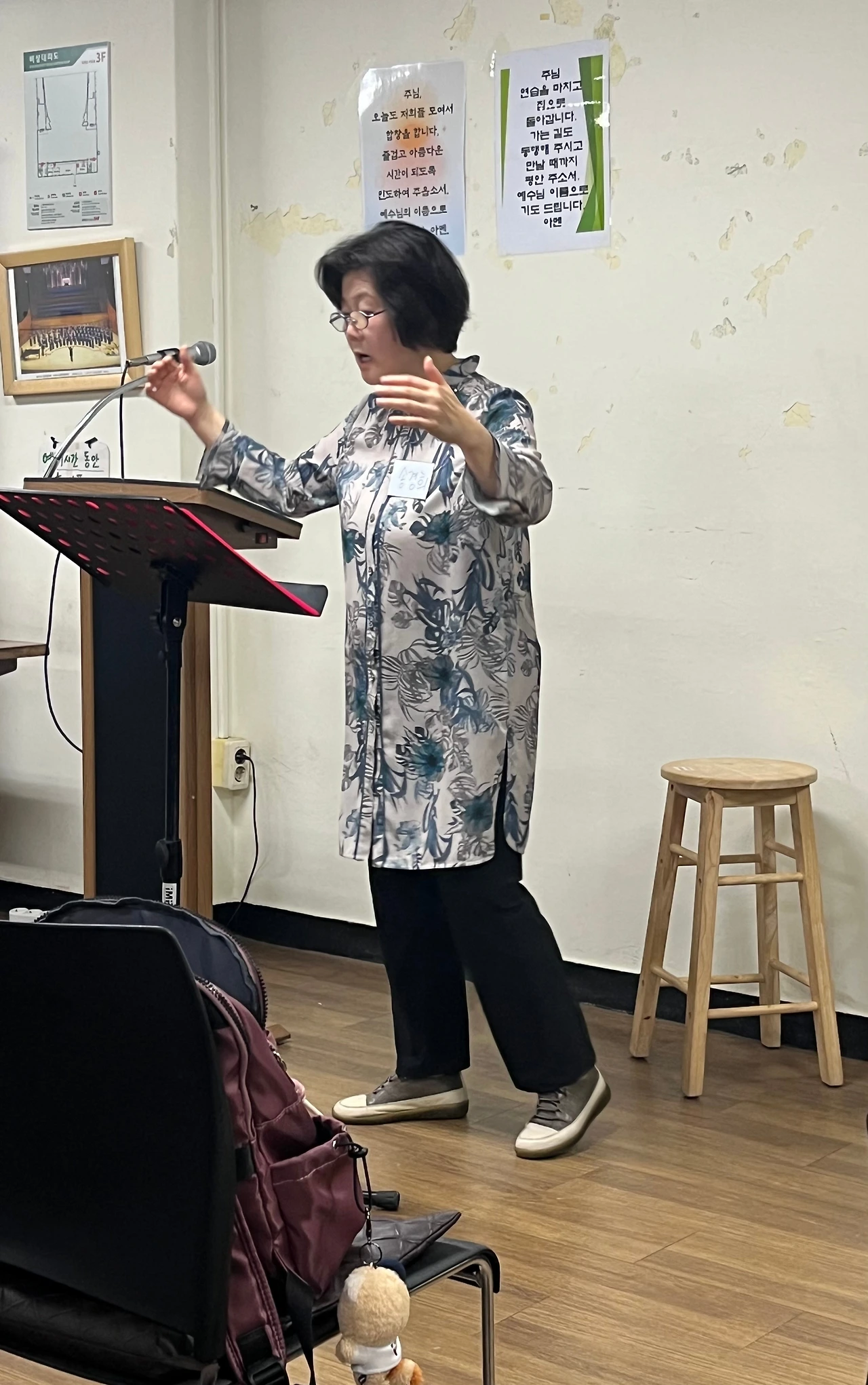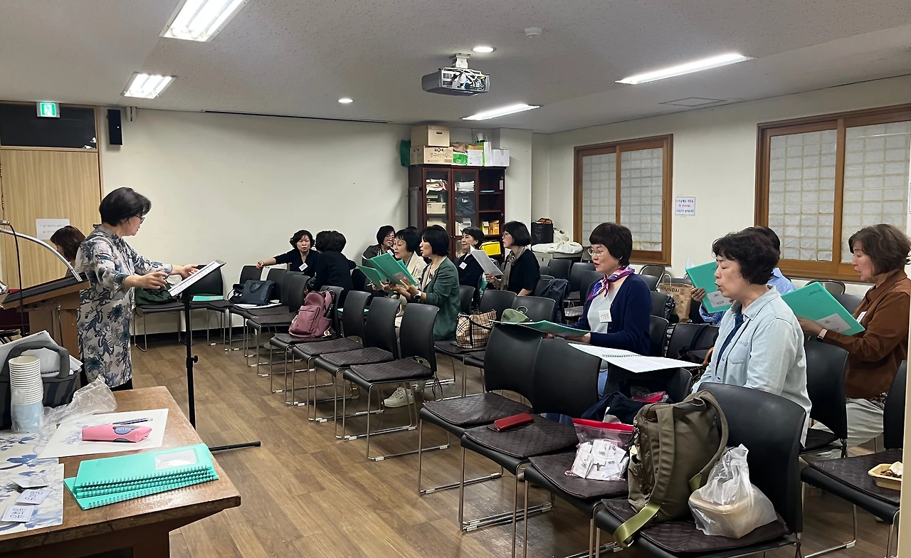 손을 자연스럽게 이리로 저리로 흔들면서 지휘자님이 아주 노련하게 합창 지도를 한다.