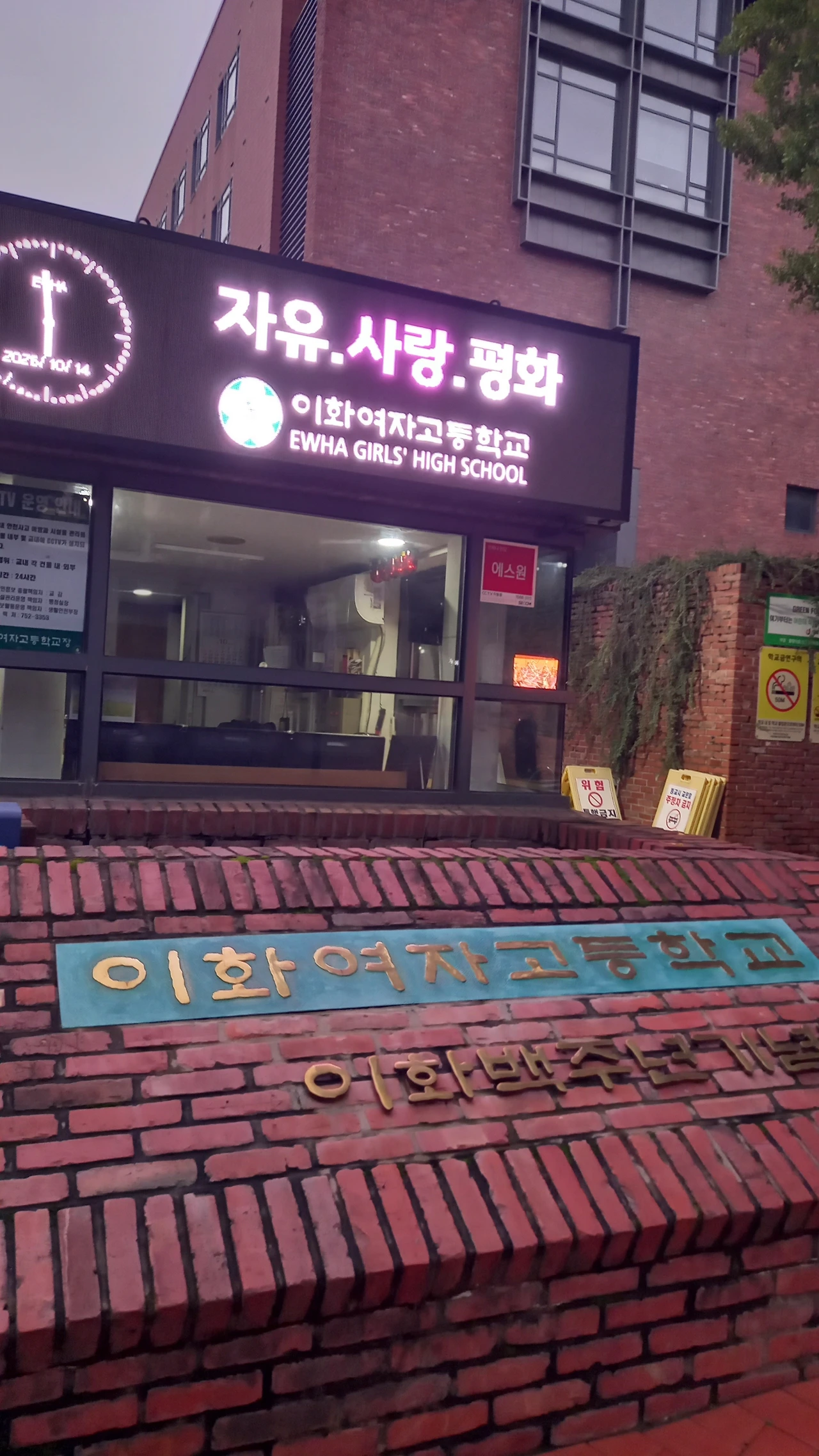나는 2시간 잡고 수원역에서 지하철을 타고 가다가 바로 뒤에 급행이 온다는 안내 방송에 성균관대역에 내려서 갈아탄다. 아까는 앉아서 갔는데 급행은 사람이 많아서 서서 간다. 서울시청역 내리니 약 15분 정도 남는다. 사진 안 찍고 빠른 걸음으로 가면 늦지는 않겠는데 나는 늘 그렇듯이 여유 있게 사진 몇 장을 담으면서 걷는다. 덕수궁 돌담길, 스크랜튼홀 건물 맨 위에 붙어있는 이화여고 명찰과 정동교회의 십자가, 이화 돌담길, 이화 교정 야경 표정이 신비롭다.